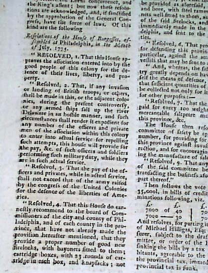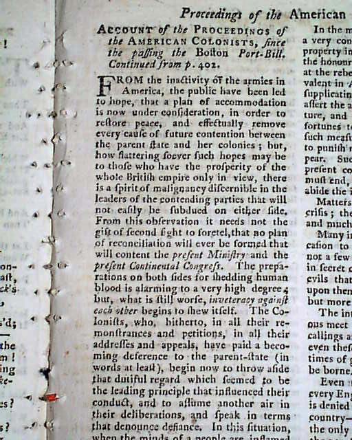 Also in the issue is an article: "An Intercepted letter from Benjamin Harrison to General Washington" which contains much on events of the war and takes nearly two pages. There is also a great & lengthy article titled: "Resolutions of Congress on the Conciliating Proposition of Parliament" on Congress rejecting the conciliation plan of Lord North, which takes over 2 pages and is signed in type: JOHN HANCOCK. The article begins: "The following paper may be considered as the ultimatum of the American Continental Congress..." and has a dateline of Philadelphia, July 31, 1775.