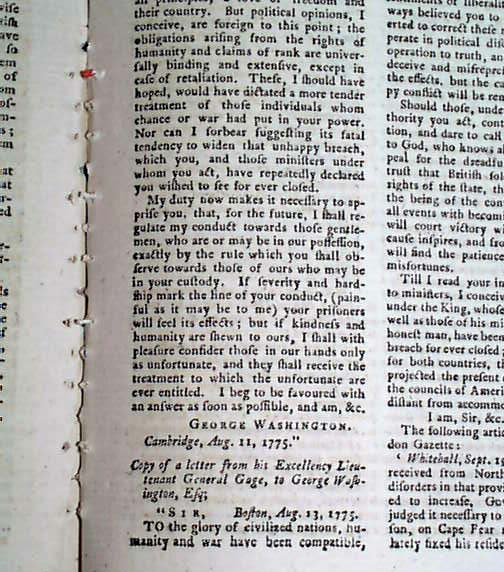 Also: "Petition of the American Congress to the King" which is signed in type: John Hancock, and an excellent article: "Account of the Proceedings of the American Colonists since Passing the Boston Port Bill". Within this article is a nice letter to General Gage, signed in type: George Washington, with his reply signed: Tho. Gage, concerning the treatment of prisoners. This full report takes 5 1/2 pages.