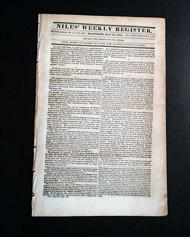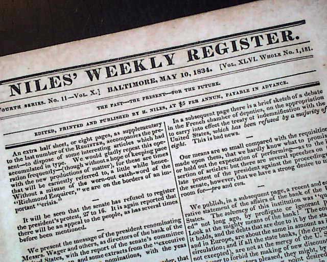 NILES' WEEKLY REGISTER, Baltimore, May 10, 1834 A brief item at the top of an inside page mentions: "Col. Crockett is yet on his "tower" to the north, and has much amused the people by his originalities, and the broad good humor that plays on his "honest face".