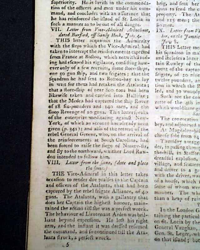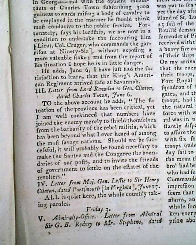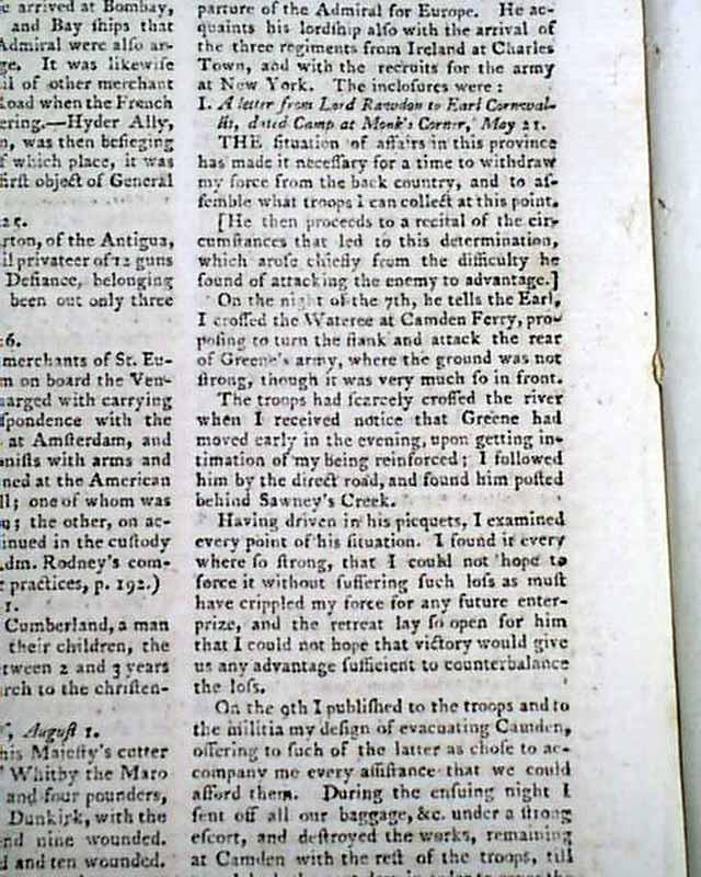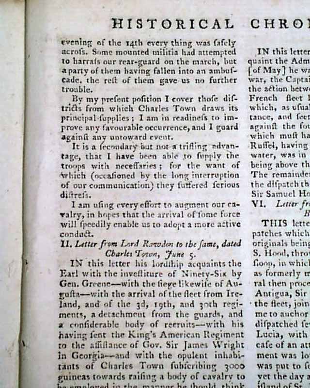 This is followed by a letter from Lord Rawdon to Cornwallis from Monk's Corner beginning: "The situation of affairs in this province has made it necessary for a time to withdraw my force from the back country & to assemble what troops I can collect at this point..." with many particulars of a battle in the Carolinas, including: "...On the 9th I published to the troops & to the militia my design of evacuating Camden..." with more. And this is followed by another letter from Lord Rawdon dated at Charleston, beginning: "In this letter his Lordship acquaints the Ear with the investiture of Ninety-Six by Gen. Greene--with the siege likewise of Augusta..." with more. And there is yet another letter from Rawdon to Gen. Clinton dated at Charleston.