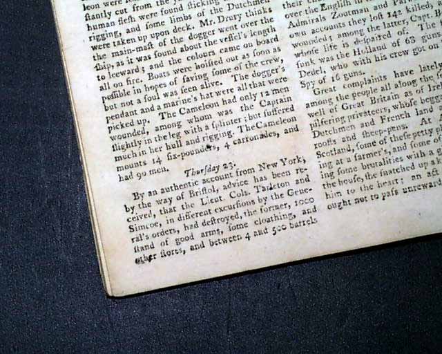 Further on is another report which includes: "...Lt. Cols. Tarleton and Simcoe...had destroyed, the former, 1000 stand of good arms, some cloathing & other stores...The General, in his march from Richmond to Williamsburg, had destroyed 2000 hogsheads of tobacco...That on the 6th of July, Earl Cornwallis having an intention to cross James River, word was brought him of the approach of the enemy..." with more.