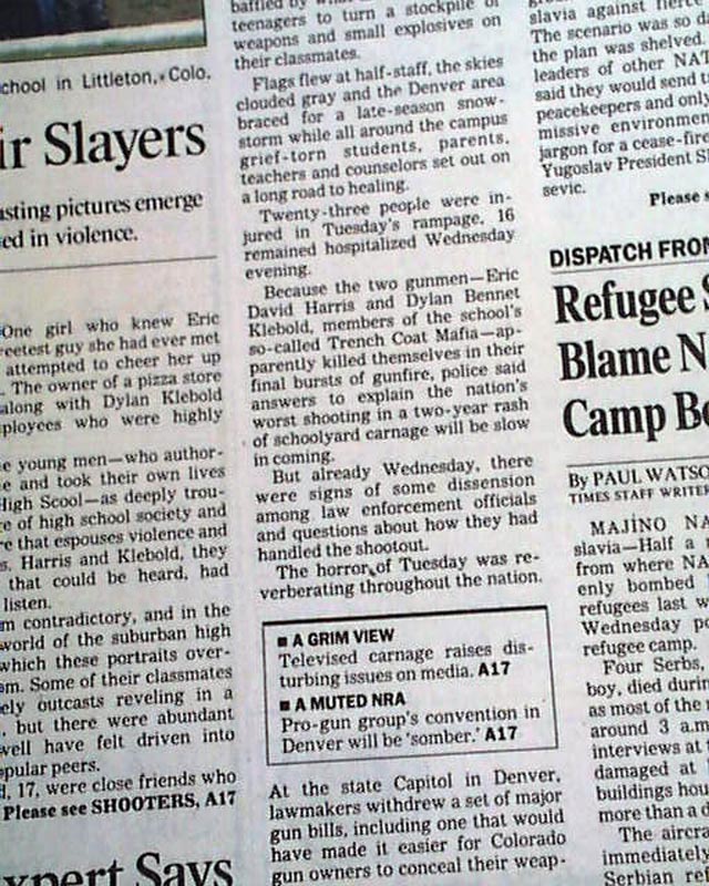 The front page has various headings that include: "Police Begin Removal of 15 Dead at School" with and 2 related photos. Much more on pages 14-17.