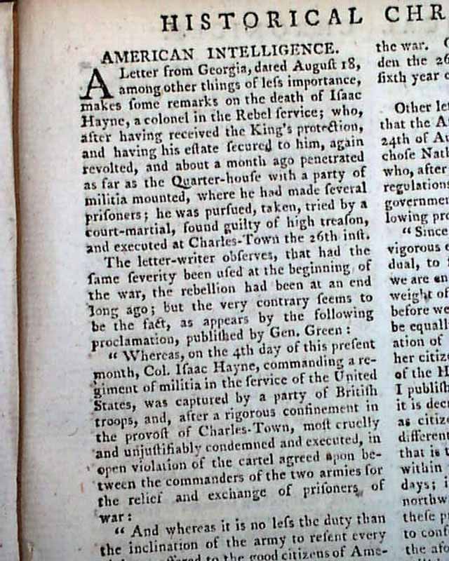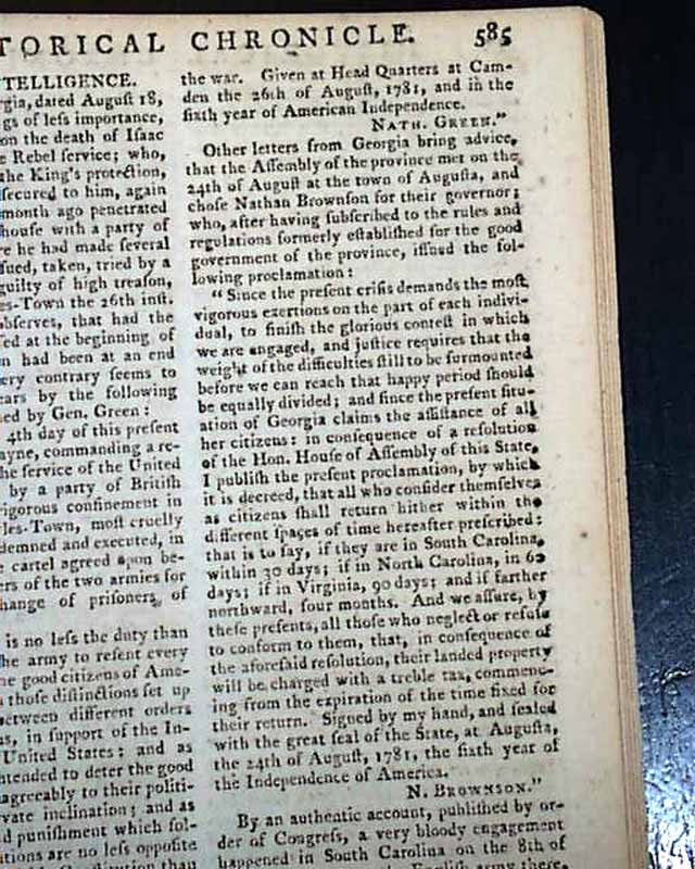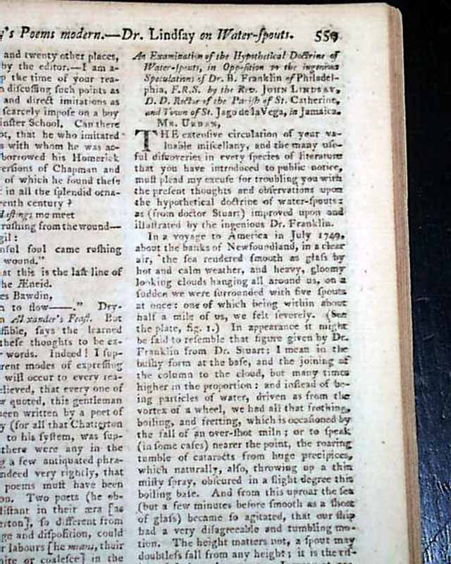 There is additional reporting on the Revolutionary War, particularly the events in Georgia & the Carolinas, including a letter signed by Nath. Greene, as well as an article on waterspouts with: "...the ingenious speculations of Dr. B. Franklin of Philadelphia..." on this topic.