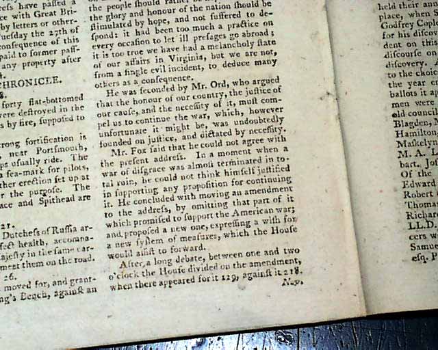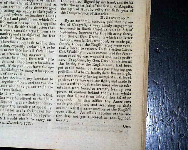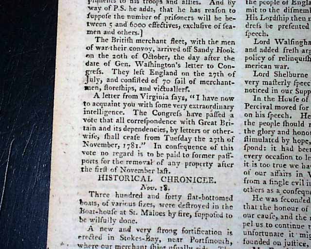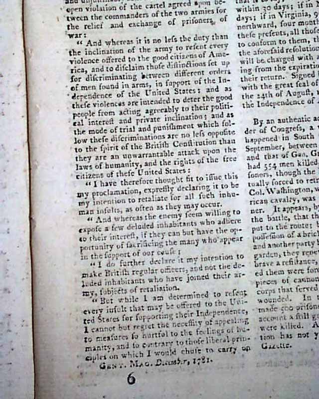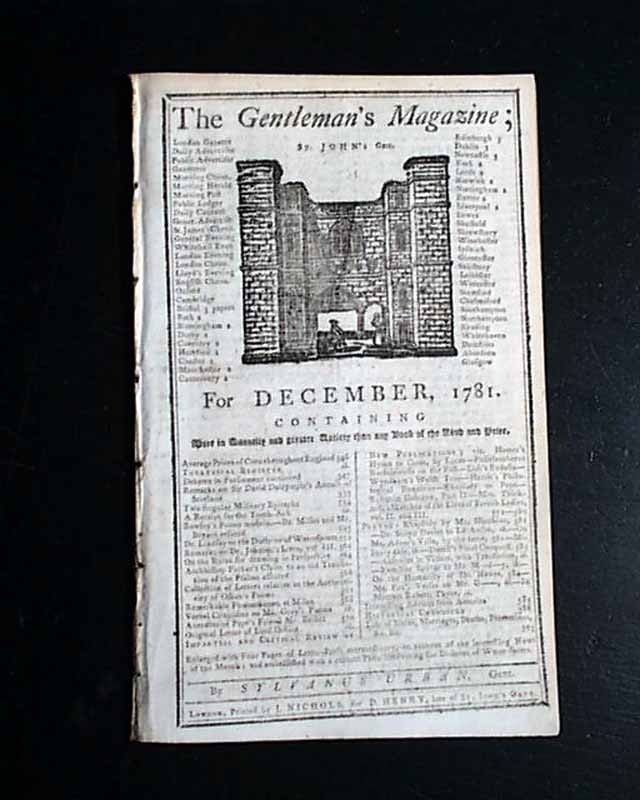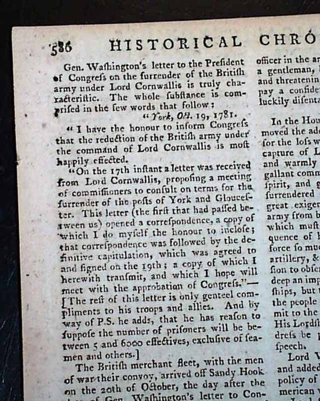 Item # 686462 THE GENTLEMAN'S MAGAZINE, London, December, 1781  Certainly the most historic report in this issue--and perhaps in any issue from the Revolutionary War--is that near the back of the issue under the "Historical Chronicle". It begins with an editorial comment: "Gen. Washington's letter to the President of Congress on the surrender of the British army under Lord Cornwallis is truly characteristic. The whole substance is comprised in the few words that follow: " and what follows is the historic letter datelined "York, Oct. 19, 1781"  which begins with the famous sentence: "I have the honour to inform Congress that the reduction of the British army under the command of Lord Cornwallis is most happily affected..." followed by further particulars on the event.
