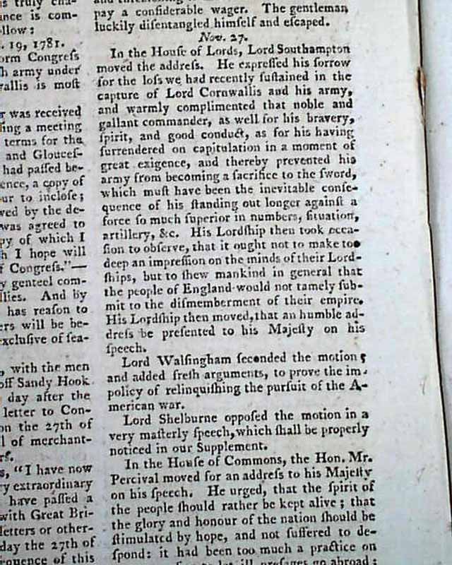 Shortly after this is a note from the House of Lords: "...expressed his sorrow for the loss we had recently sustained in the capture of Lord Cornwallis and his army & warmly complimented that noble & gallant commander as well for his bravery, spirit & good conduct as for his having surrendered on capitulation in a moment of great exigence & thereby prevented his army from becoming a sacrifice to the sword..." with a bit more.