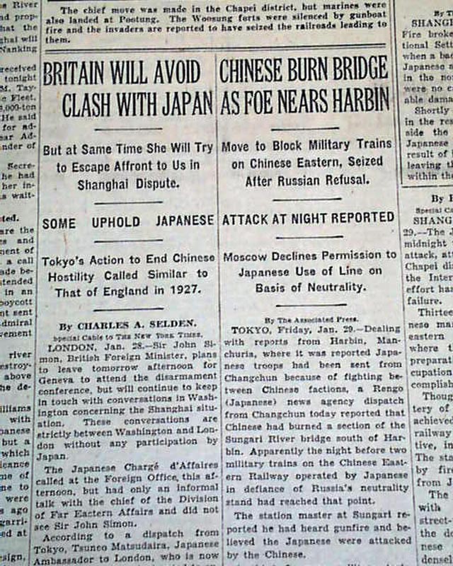 The top of the front page has a four column headline: "JAPANESE UNABLE TO OCCUPY SHANGHAI DESPITE 13-HOUR LAND AND AIR ATTACK; STIMSON ASKS TOKYO TO TELL INTENTION" with many subheads and related map. Much more on the following pages with a few photos. Loads of text. Always nice to have notable events in history reported in this World famous publication.