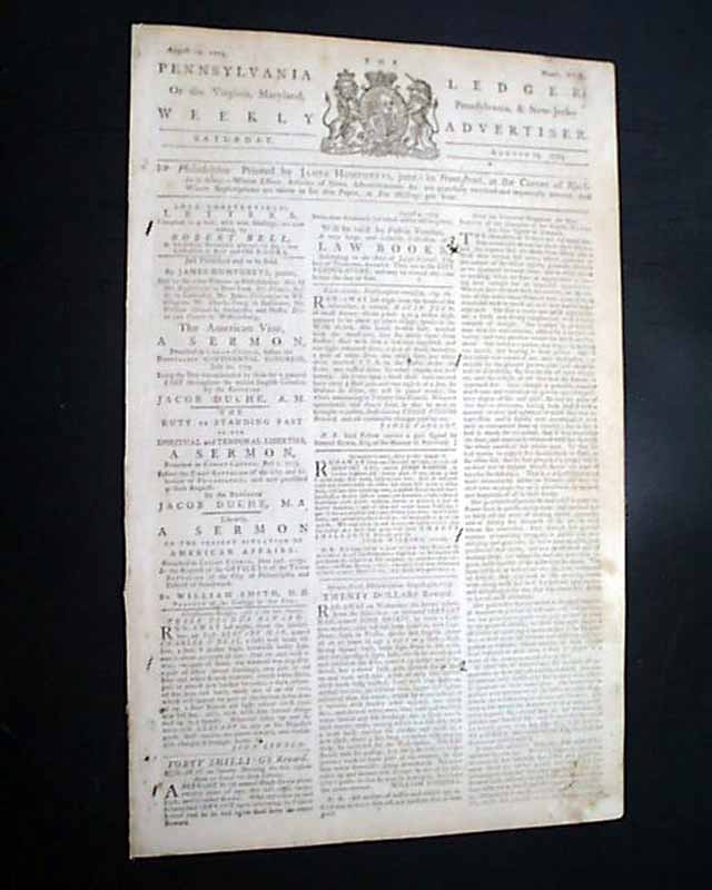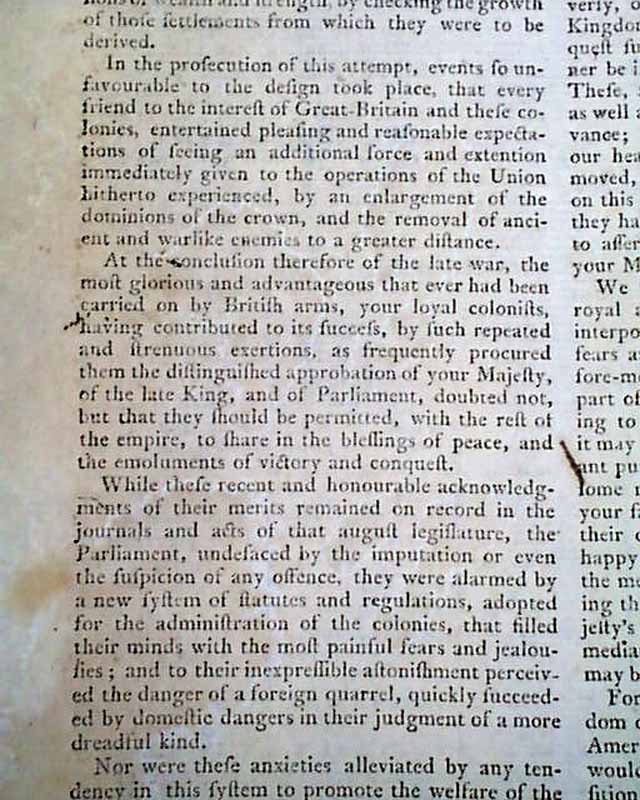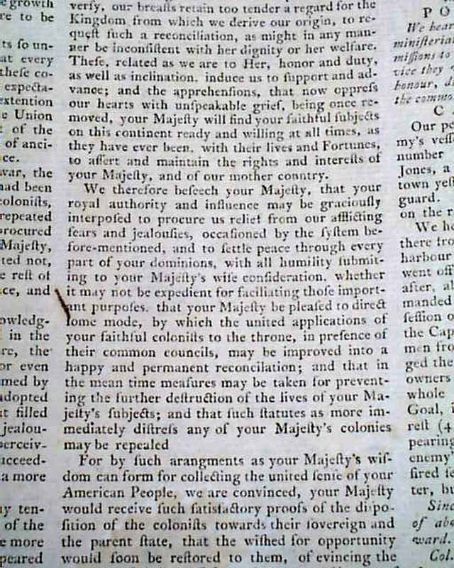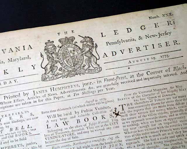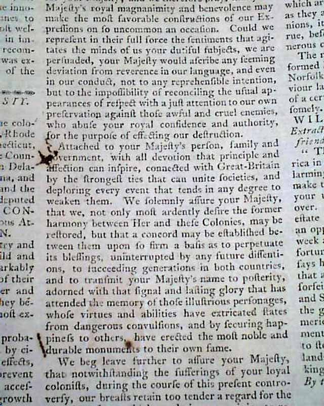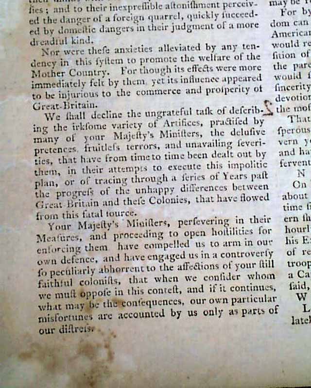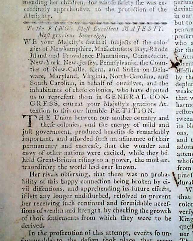 PENNSYLVANIA LEDGER, Philadelphia, Aug. 19, 1775  Certainly the most notable content in this issue is found taking over half of page 2, being the very historic Olive Branch Petition.