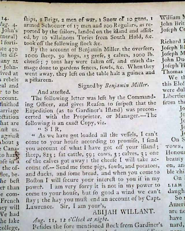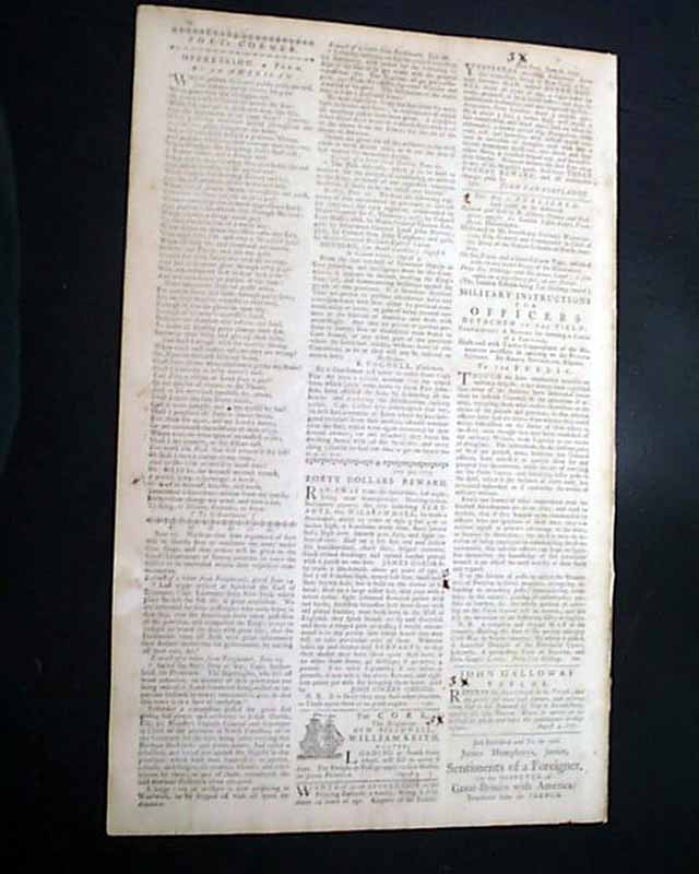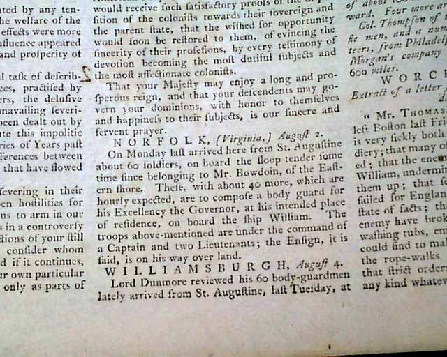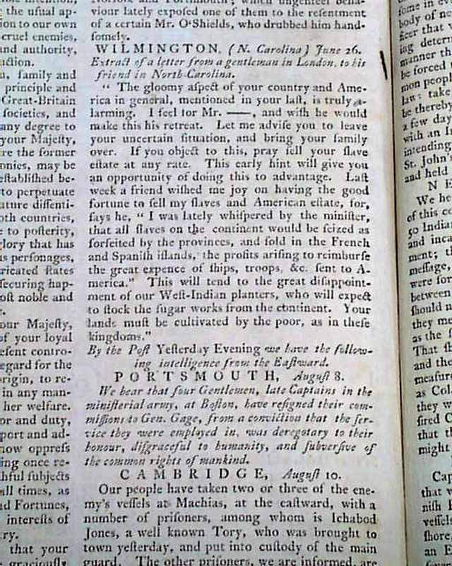 This issue has other fine war-related content as well including a letter from London to a friend in North Carolina noting in part: "The gloomy aspect of your country & America in general...is truly alarming...advise you to leave your uncertain situation & bring your family over...". Page 3 has a letter noting in part: "...that General Gage has demolished the Castle. Mr. Hancock shewed me a letter from a gentleman in Boston...that General Gage had sent all his family to England & that the whole army would leave Boston soon, 'twas supposed he would first destroy the town; the destination of the troops is not known, may it not be for New York?...there are 2500 of Gage's men killed & died since the battle of Bunker's Hill; they have buried 30 Regulars a week for a long time...Mr. Hancock shewed me a letter from General Washington which confirms the departing of the troops." More war-related content as well.