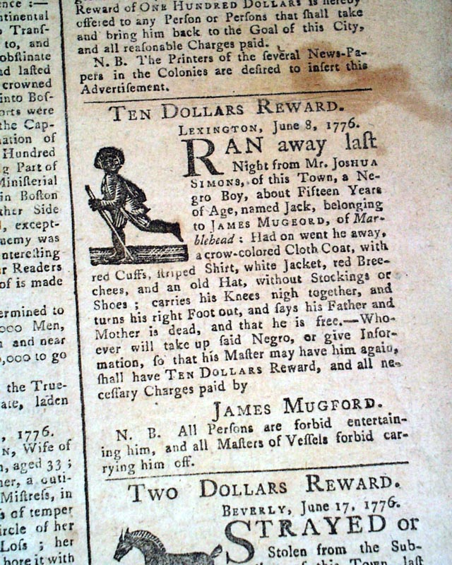 This is the volume one, number one issue of a very rare newspaper. Its rarity would seem to be sufficient for its desirability, as it lasted for only seven weekly issues, from June 18 thru July 30, 1776.