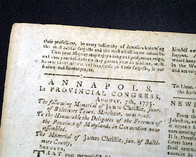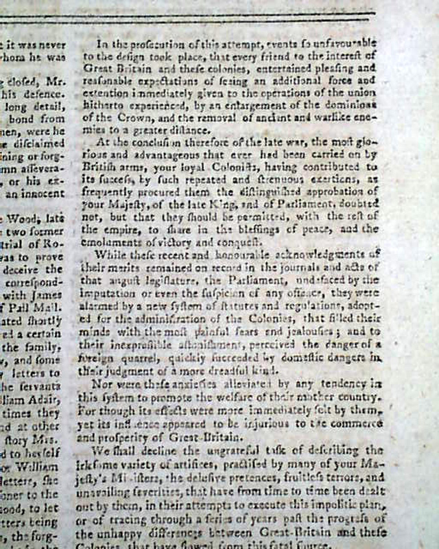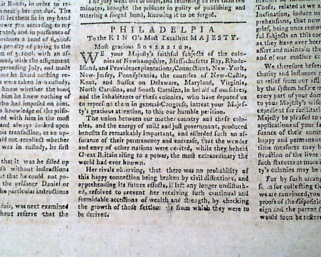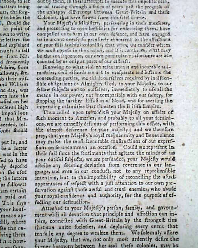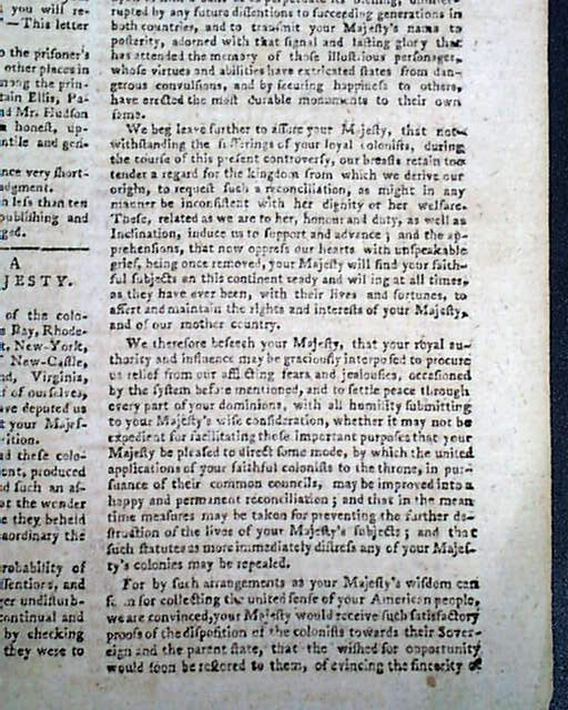 Certainly the most notable content in this issue is found taking over a full column of page 1 and a bit of page 2, being the very historic Olive Branch Petition.