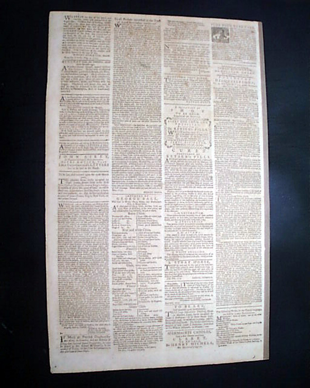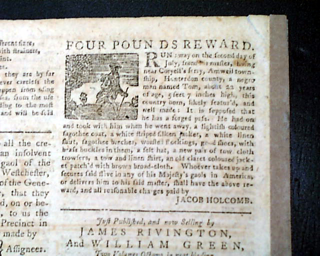James Rivington, the famous printer of this newspaper, had an interesting career. He began this newspaper in 1773 initially with an impartial stance which shifted as a revolution loomed and public opinion polarized, until by late 1774 he was advocating the restrictive measures of the British government with such great zeal and attacking the patriots so severely, that in 1775 the Whigs of Newport resolved to hold no further communication with him. The Sons of Liberty hanged Rivington in effigy. On May 10, 1775, immediately after the opening of hostilities, the Sons of Liberty gathered and mobbed Rivington’s wife's home and press. Rivington fled to safety while his office & press were destroyed, the lead type converted into bullets. Another mob burned Rivington's house to the ground.