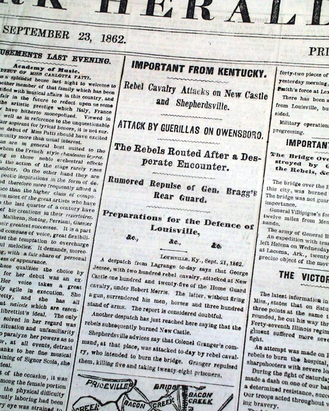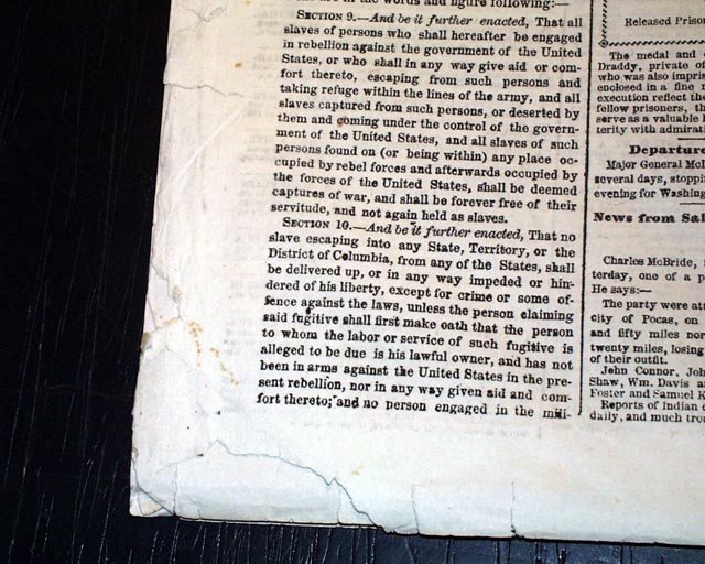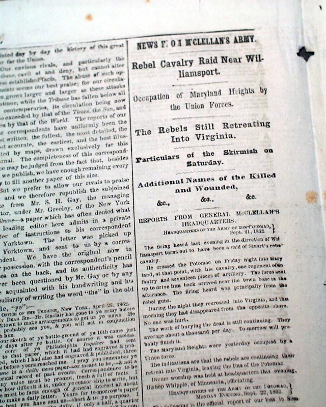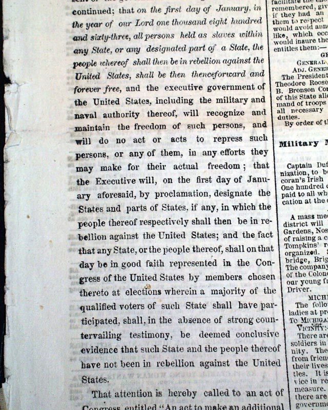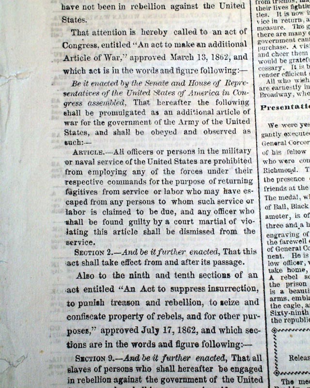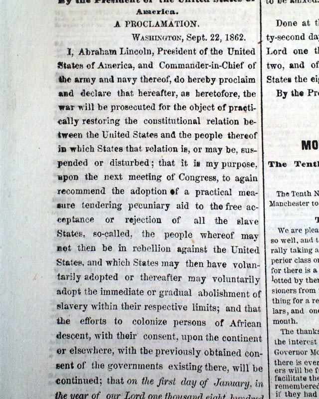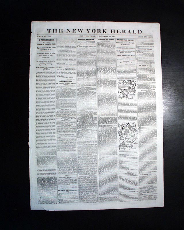 THE NEW YORK HERALD, Sept. 23, 1862  A terrific issue with this historic content, as the entire text of President Abraham Lincoln’s famous Emancipation Proclamation is contained in the first two columns of the front page. More typically this text is found on inside pages of most newspapers.