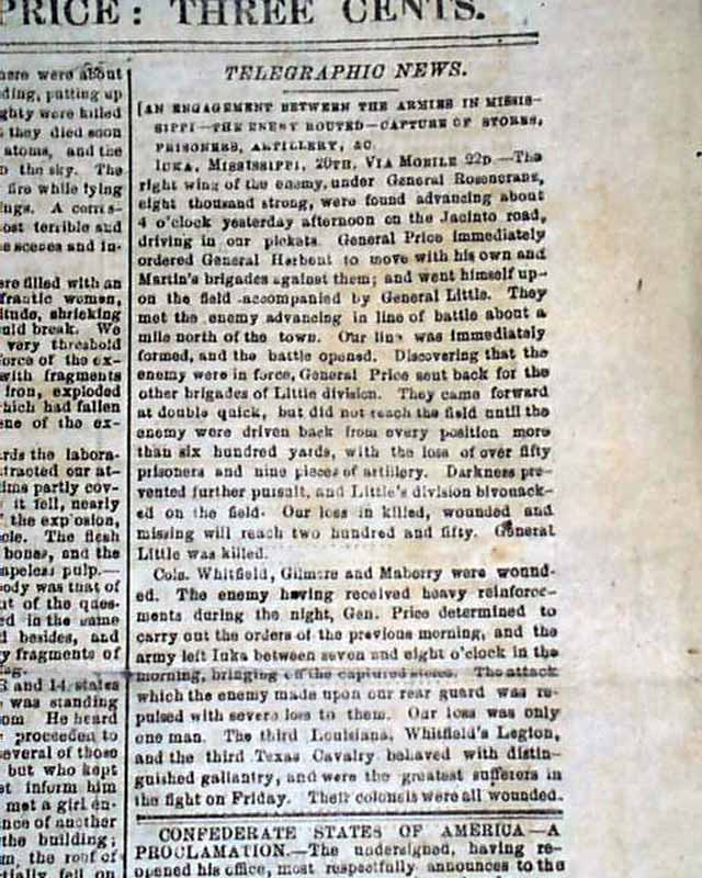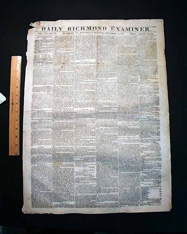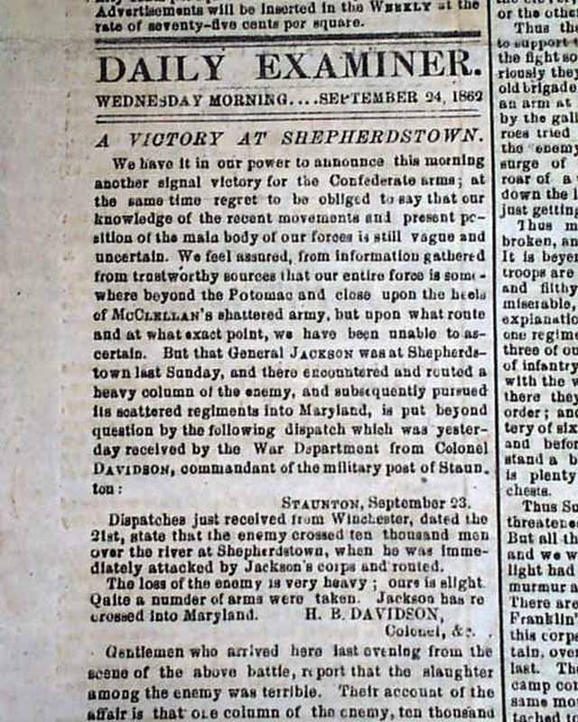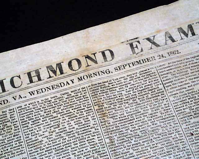 DAILY RICHMOND EXAMINER, Virginia, Sept. 24, 1862 A terrific and rare issue, as the front page has a nice account of the Battle of Antietam (referred to as Sharpsburg by the Confederates). Simply great to have reports on this "bloodiest day of fighting" of the entire war--and a victory claimed by both sides (although essentially a draw)--appear on the front page of the newspaper from the Confederate capital.