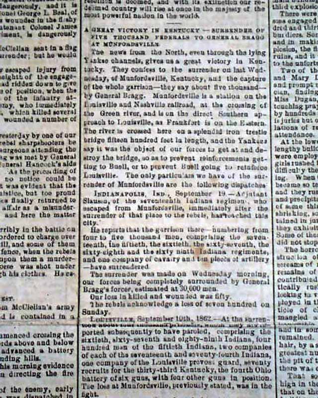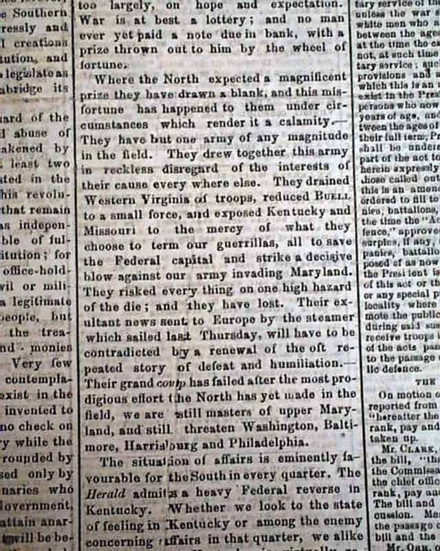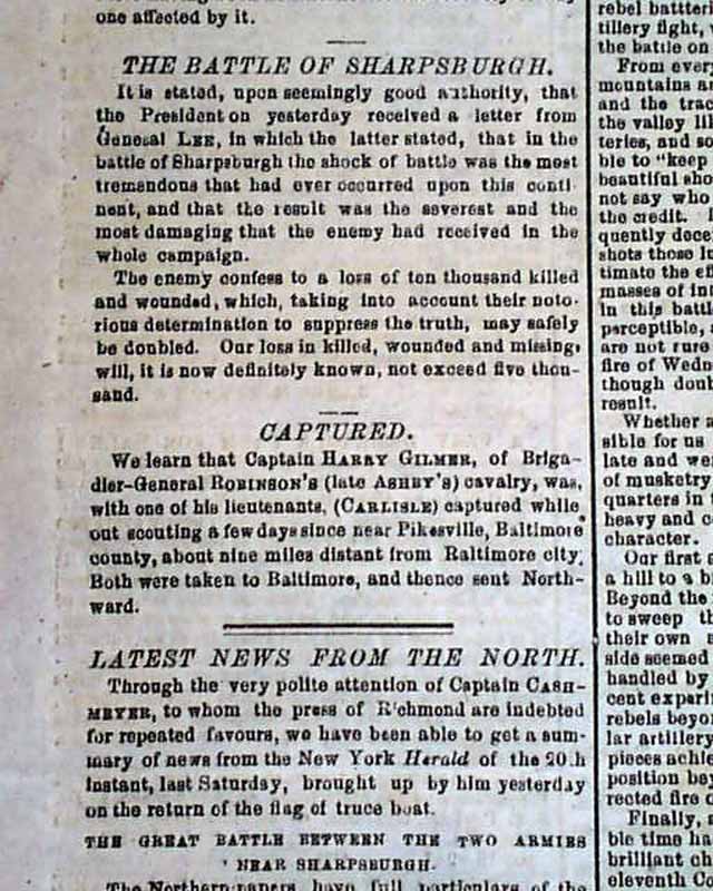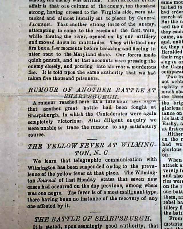 The first article on the front page is: "A Victory at Shepherdstown" which was essentially a follow-up to the Battle of Antietam. The article begins: "We have it in our power to announce this morning another signal victory for the Confederate arms...". This is followed by a brief item: "Rumour of Another Battle at Sharpsburgh" and "The Battle of Sharpsburgh which includes: "...that the President on yesterday received a letter from General Lee...the shock of battle was the most tremendous that had ever occurred upon this continent & that the result was the severest & the most damaging that the enemy had received in the whole campaign. The enemy confess to a loss of ten thousand killed & wounded...".