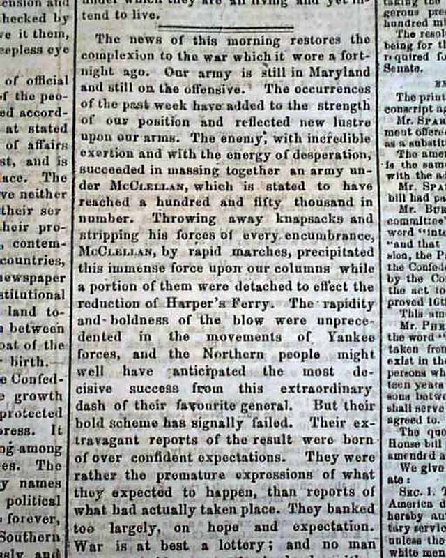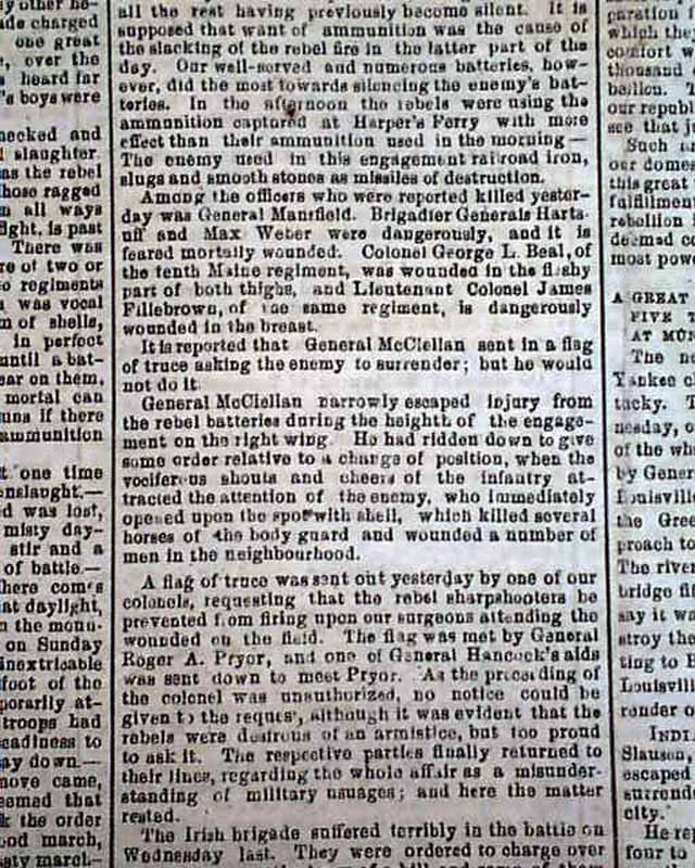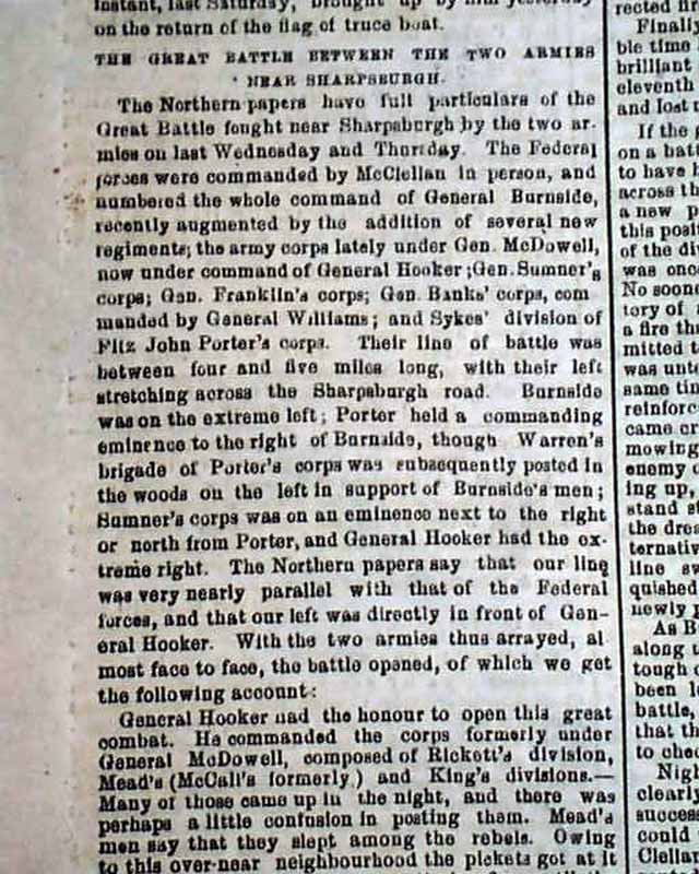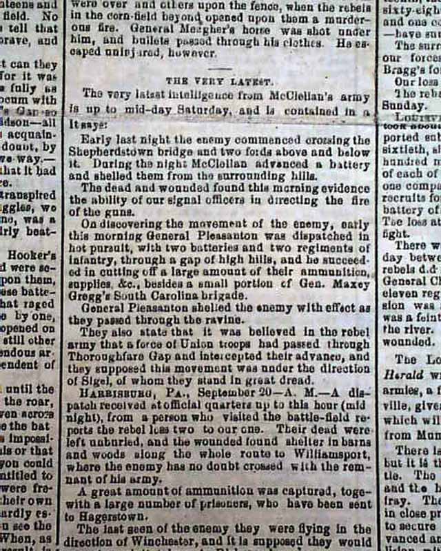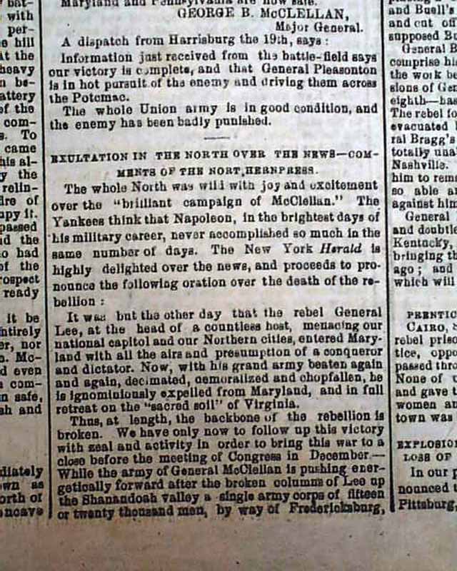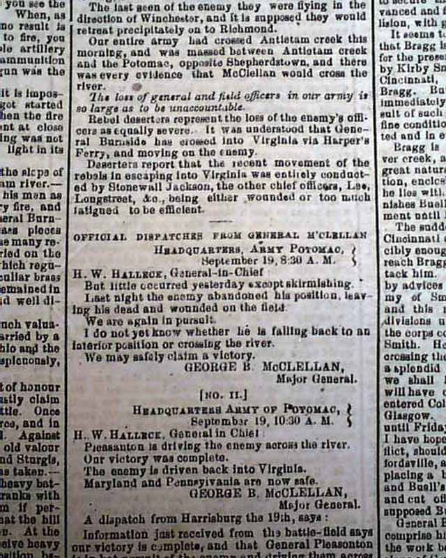 There is still more on the front page with: "Latest News From The North" with subheads: "The Great Battle Between the Two Armies Near Sharpsburgh" "Incidents of the Fight" "The Very Latest" & more, plus two dispatches concerning the battle signed in type: George B. McClellan, Major General. This lengthy & detailed text takes over 2 1/2 columns on the ftpg.