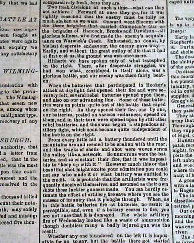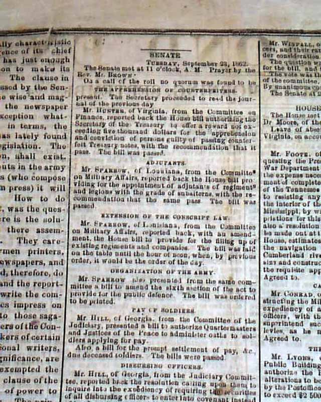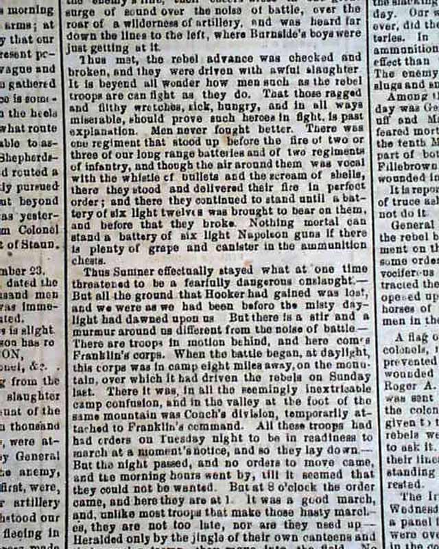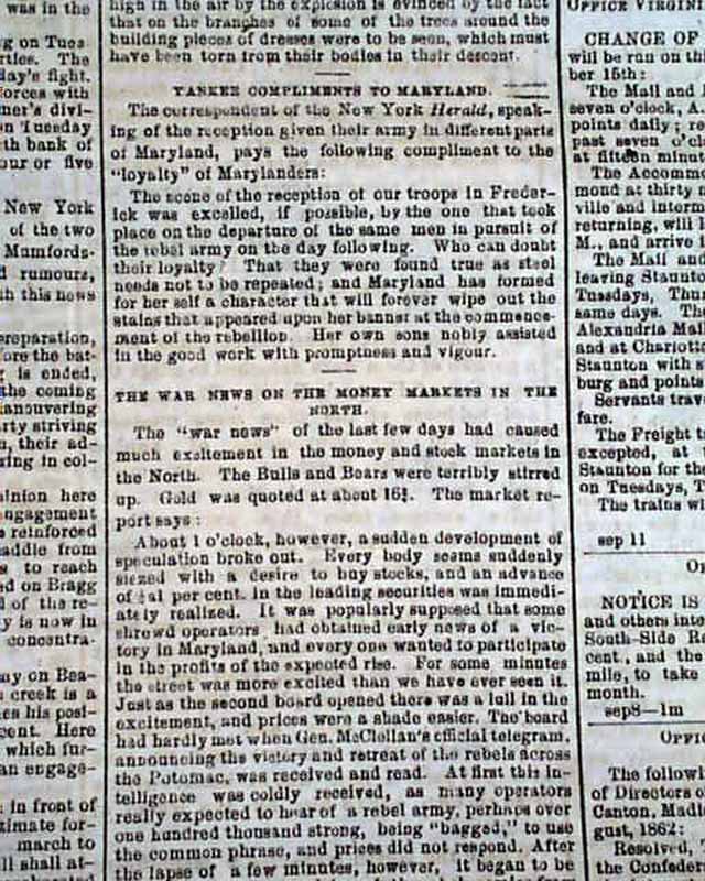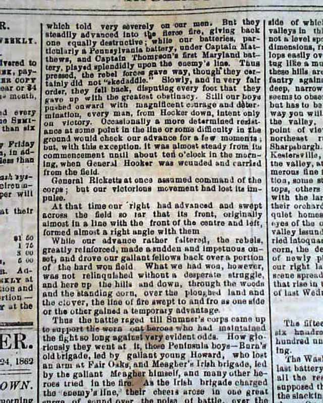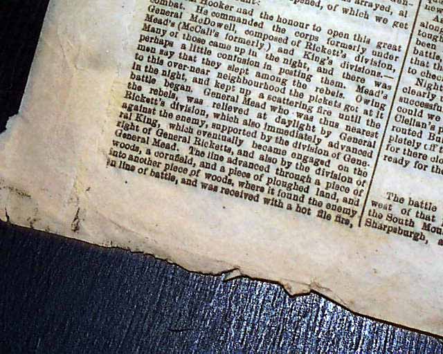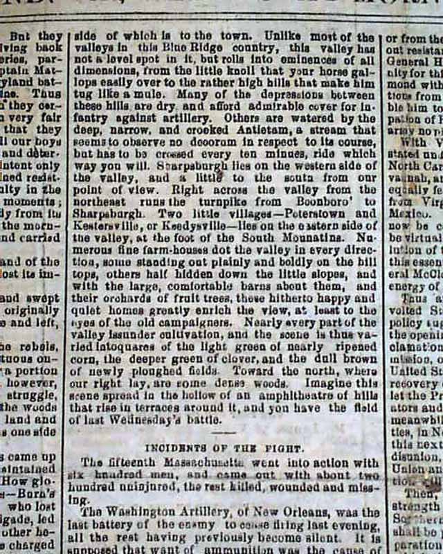 There is still more on the front page with: "Latest News From The North" with subheads: "The Great Battle Between the Two Armies Near Sharpsburgh" "Incidents of the Fight" "The Very Latest" & more, plus two dispatches concerning the battle signed in type: George B. McClellan, Major General. This lengthy & detailed text takes over 2 1/2 columns on the ftpg.