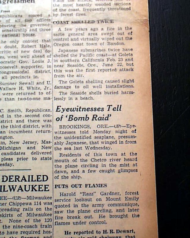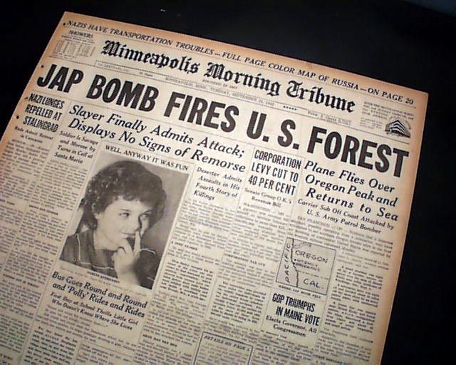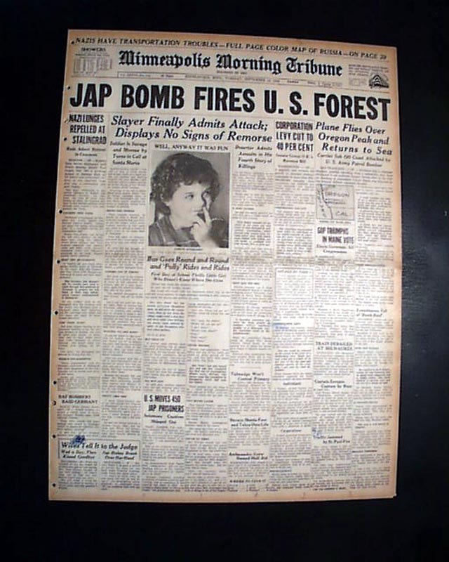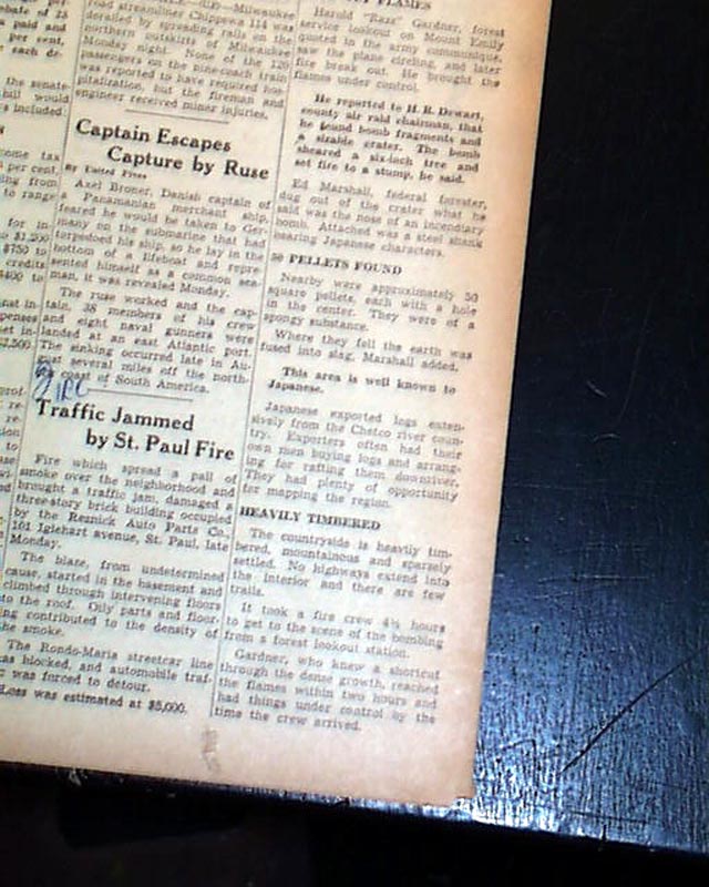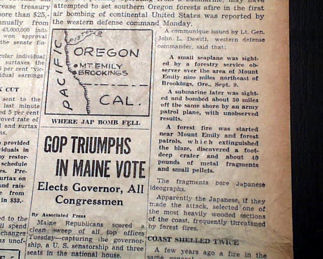 The front page has a banner headline: "JAP BOMB FIRES U. S. FOREST" with subhead and small related map. Nice for display. This event was the first time the contiguous United States was bombed by an enemy aircraft. Always nice to have notable events in history reported in this World famous publication.