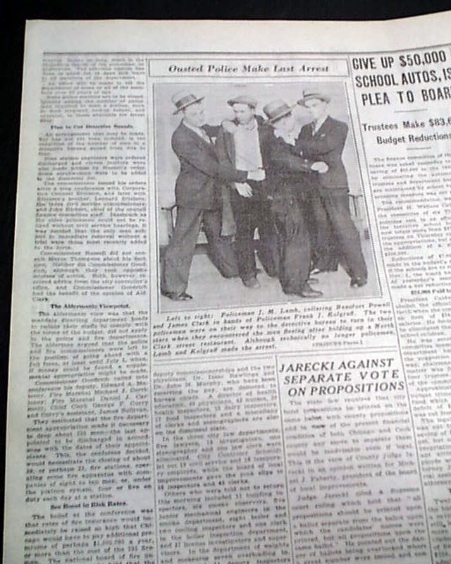 The front page has a nice banner headline concerning the gangland wars in Chicago that reads: "FIRE 473 YOUNG POLICEMEN" with subheads. Nice for display. Related photo is on the back page.
