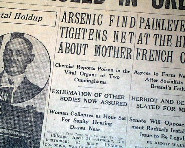 The front page has a one column heading: "ARSENIC FIND TIGHTENS NET ABOUT MOTHER" with subheads. (see)