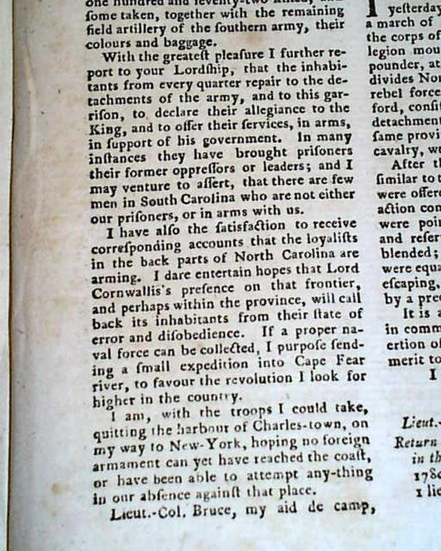 Inside has a letter from Gen. Clinton providing additional details about the situation in South Carolina following the surrender of "Charles-Town" [Charleston].