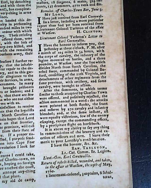 This is followed by: "Total of the Rebel Forces commanded by Major-General Lincoln at the Surrender of Charles-Town, May 12, 1780, now prisoners of War", and another brief note signed: H. Clinton, then followed by a letter signed by Ban. Tarleton regarding his efforts in the battle at Waxhaws, South Carolina, including: "...at Wacsaw [sic]...the rebel force commanded by Col. Buford consisting of the 11th Virginia, and detachments of other regiments from the same province...were brought to action....After the summons...were offered and politely rejected, the action commenced...both flanks were equally victorious...few of the enemy escaping...".