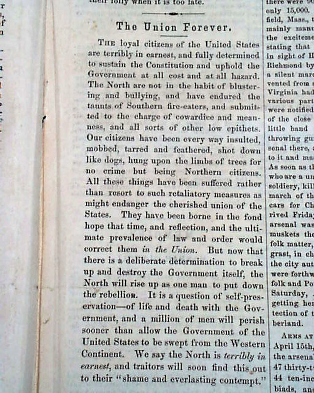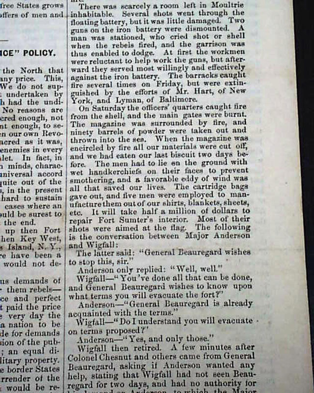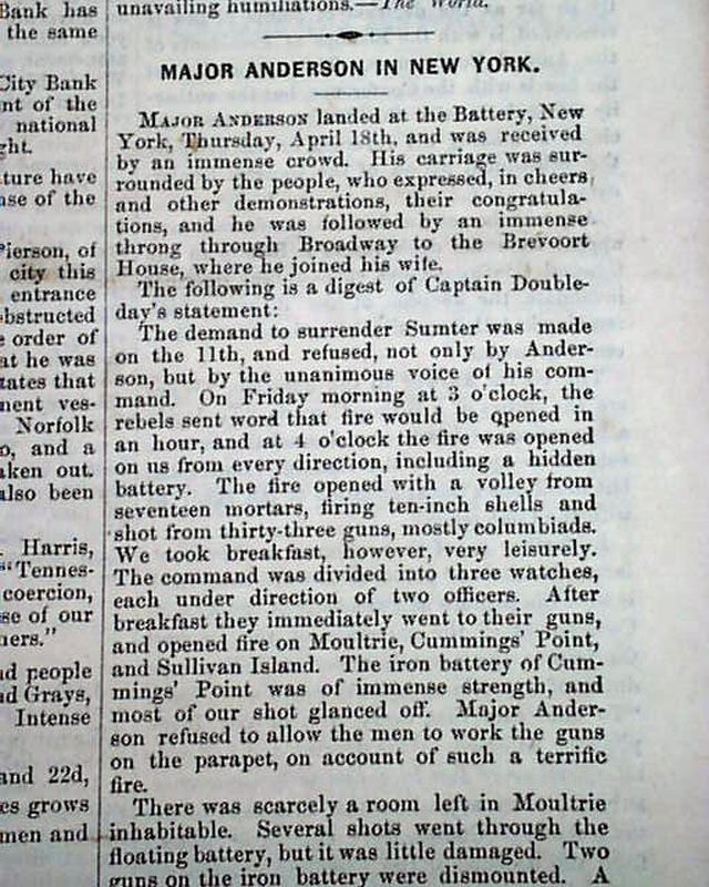 From the beginning weeks of the Civil War, the front page has a great editorial: "The 'Peace At Any Price' Policy". Also: "Major Anderson in New York" in which he reflects upon the beginning actions of the Civil War in Charleston harbor.