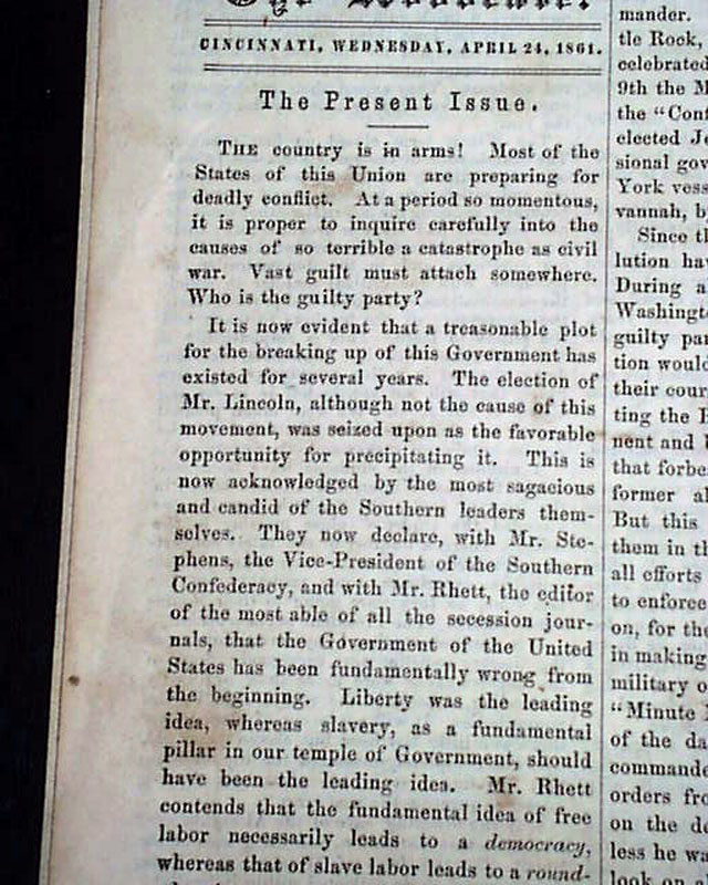 Page 4 has another editorial: "The Present Issue" which begins: "The country is in arms! Most of the States of this Union are preparing for deadly conflict..." and much more, taking two columns.