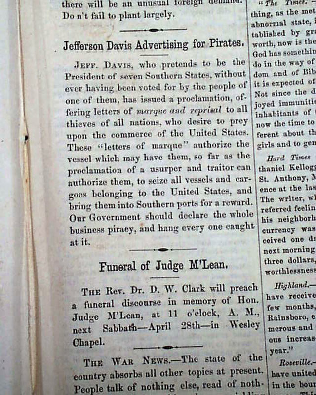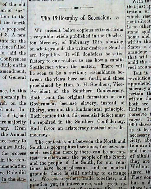 Also: "The Philosophy of Secession" "Jefferson Davis Advertising for Pirates" "The Union Forever" and: "Current Events" concerning the Civil War.