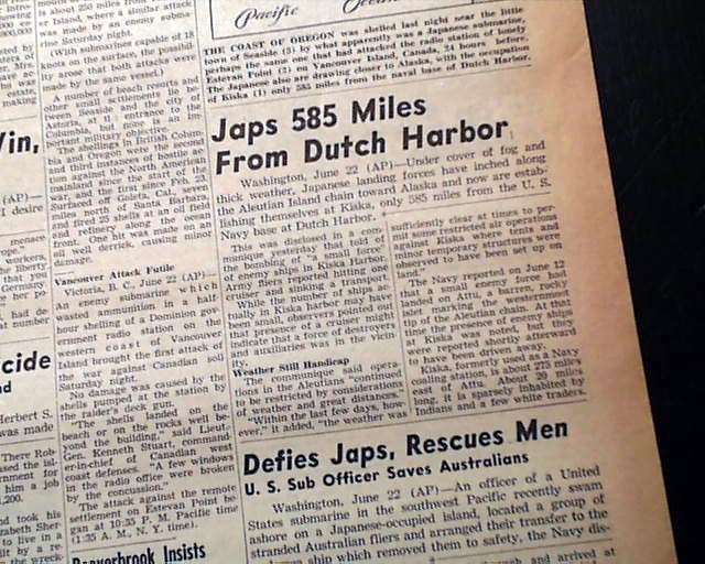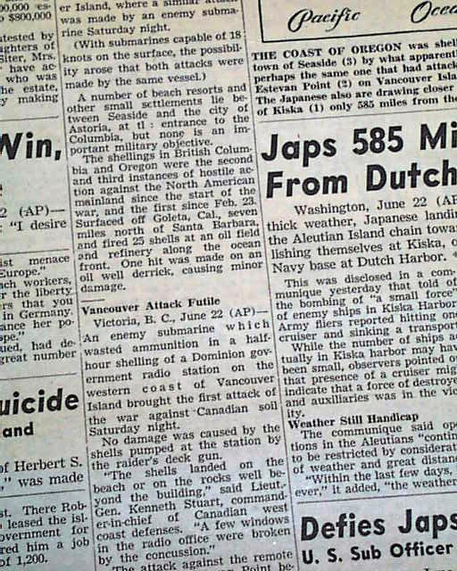 The front page announces a rare occurrence in American history with nice headline: "OREGON SHELLED; SUB HUNTED" The top of age 3 has a three column heading: "Shelling of Oregon Laid to Jap Sub" with related map. (see) On the nights of June 21 and 22, 1942, the Japanese submarine I-25 fired 17 shells at Fort Stevens, Oregon, making it the only military installation in the continental United States to receive hostile fire during World War II (the oil fields in Santa Barbara, California that were also shelled by the Japanese, was not considered a military installation).