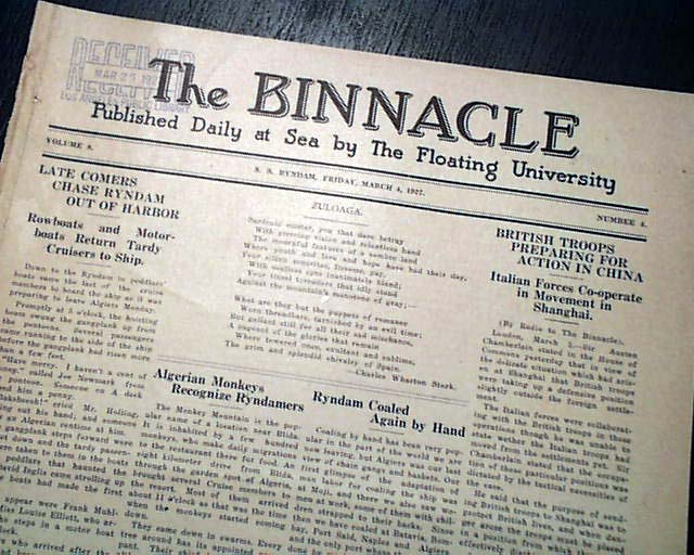 THE BINNACLE, S.S. Ryndam, March 4, 1927 Subtitled: "Published Daily at Sea by The Floating University." An interesting little "in-house" newspaper published on board the mentioned ship which was an early floating university which traveled the world.