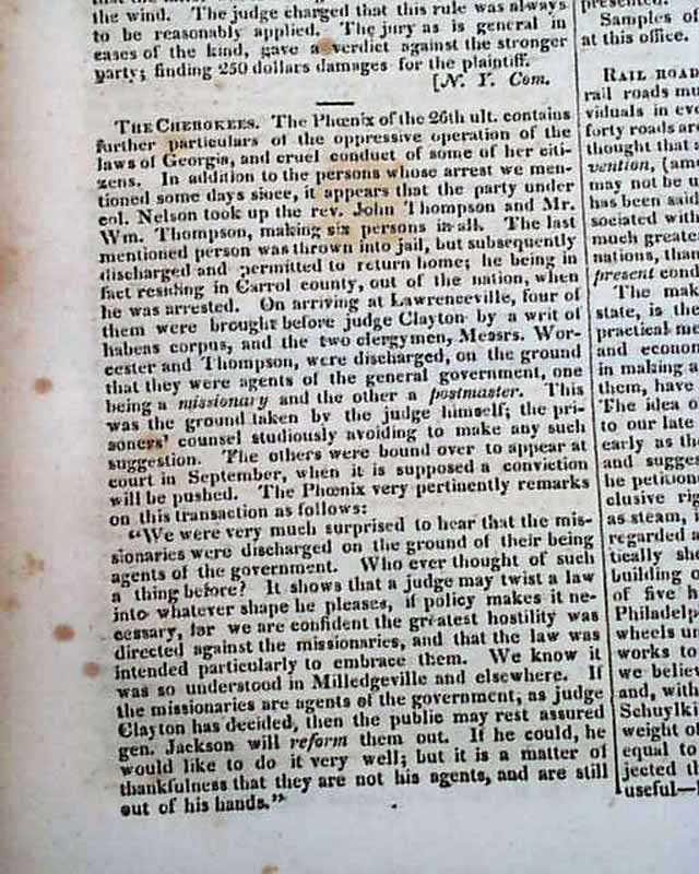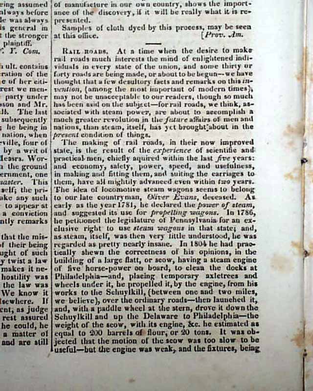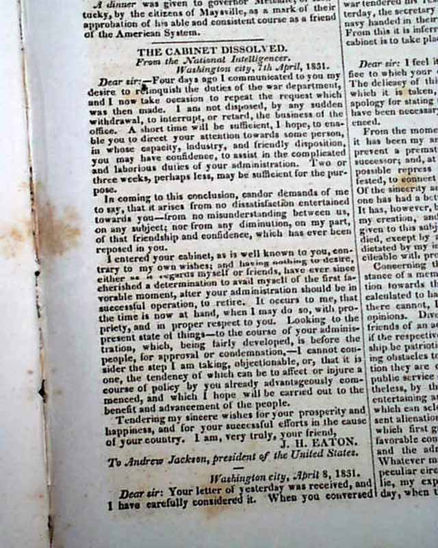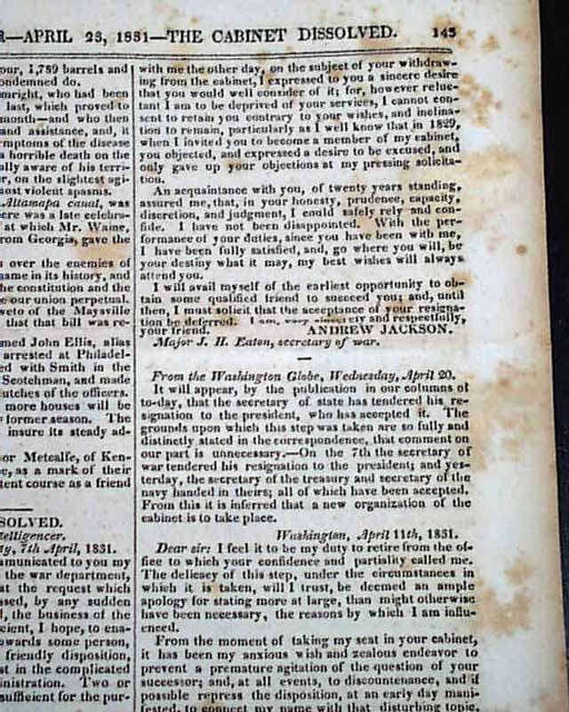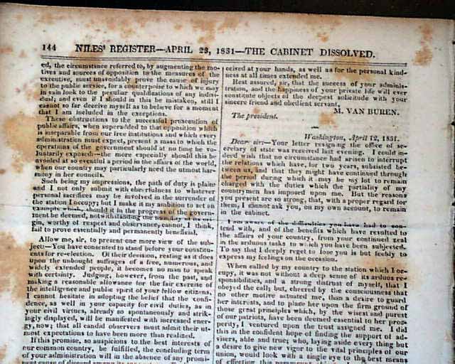 A very lengthy article: "Rail Roads" takes nearly 6 pages and is very early discussion on the creation & growth of the rail system in the United States. "The Cabinet Dissolved" includes 2 letters signed: Andrew Jackson and one by: M. Van Buren.