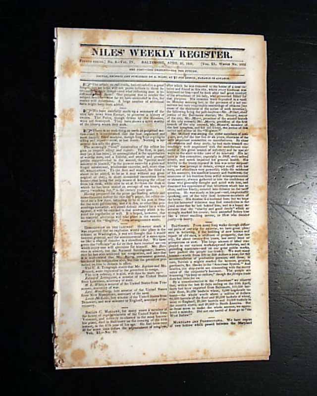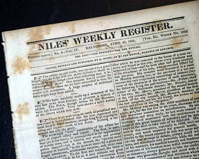NILES WEEKLY REGISTER, Baltimore, April 23, 1831 A brief report: "Liberia" reports that: "...The recaptured Africans have wonderfully improved...". "The Cherokees" begins: "The Phoenix of the 26th contains further particulars of the oppressive operation of the laws of Georgia & cruel conduct of some of her citizens..." & more.