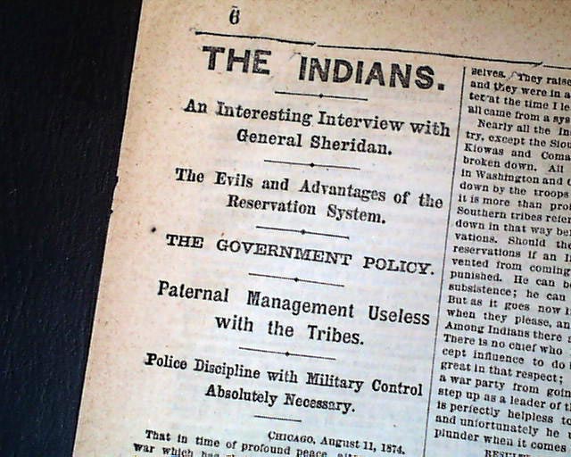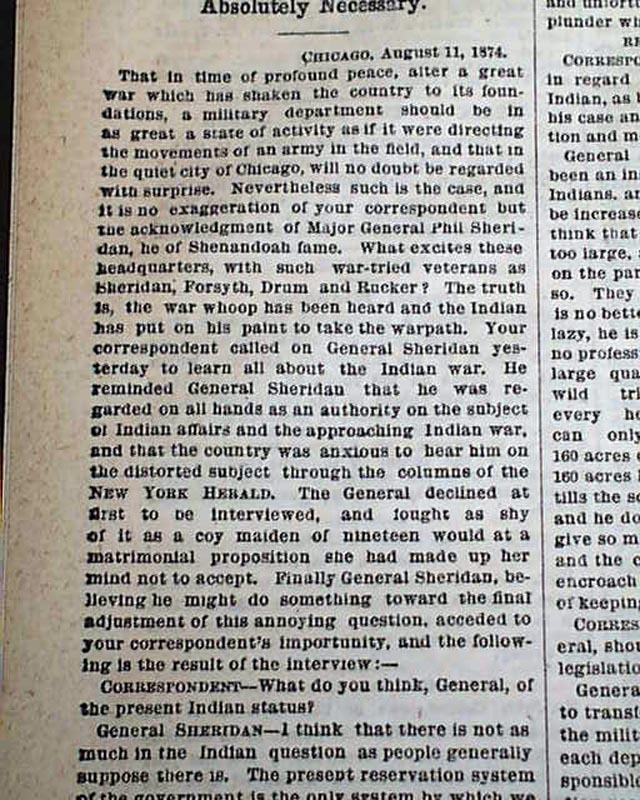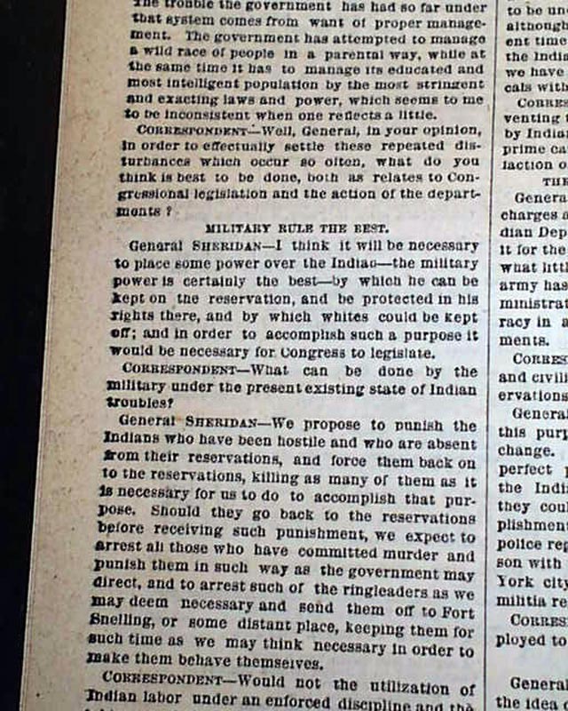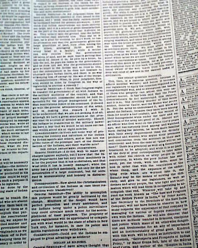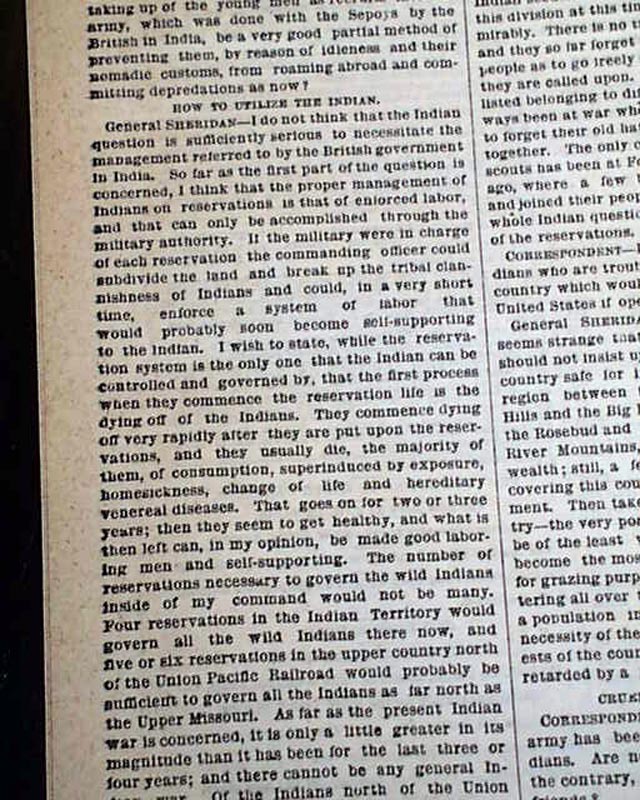 Page 6 has a lengthy article on the current situation in the Great Plains that takes over 2 1/2 columns with headings: "THE INDIANS" "An Interesting Interview with General Sheridan" and more. (see)