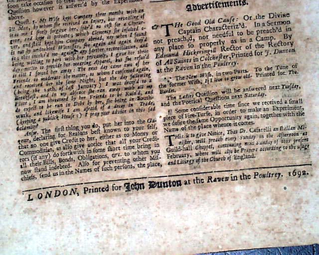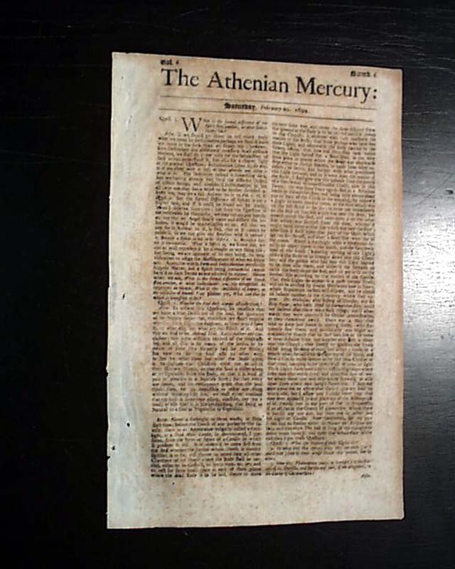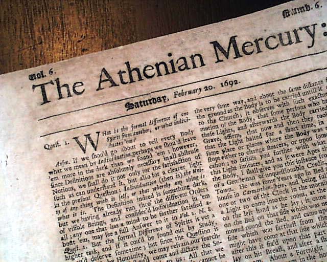 THE ATHENIAN MERCURY, London, Feb. 20, 1692  This was the very first of the "agony aunt" newspapers, a newspaper providing personal advice to its readers.