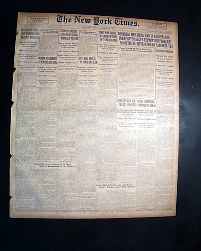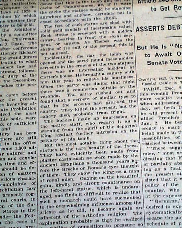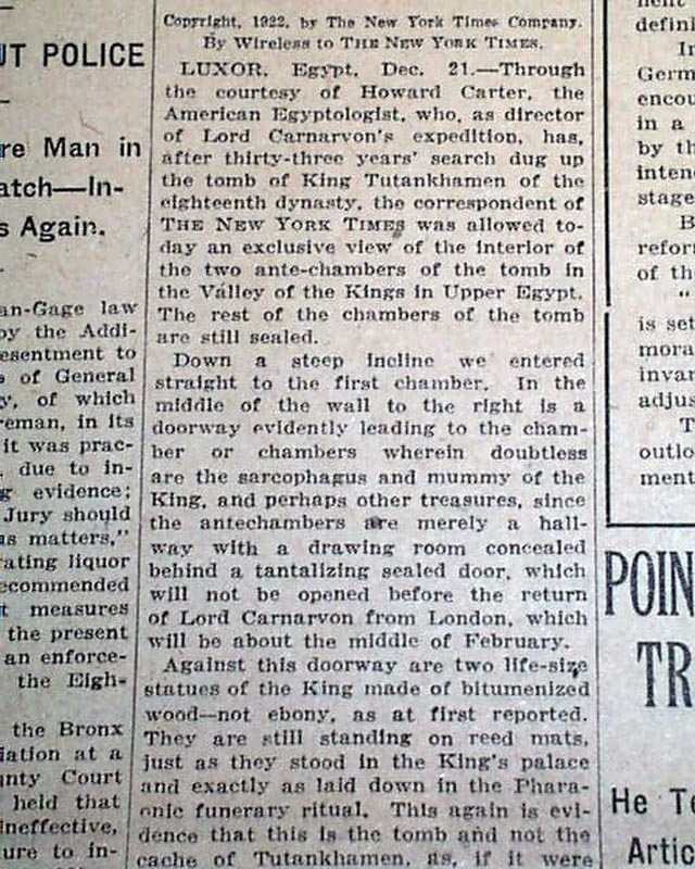 The top of the front page has a one column heading: "TIMES MAN VIEWS SPLENDORS OF TOMB OF TUTANKHAMEN" with subheads. (see) This was during the historic discovery of King Tut's tomb by British archaeologist Howard Carter. It would not be for another couple of months before the room containing the mummy of King Tut would be opened, sparking another flurry of international attention.