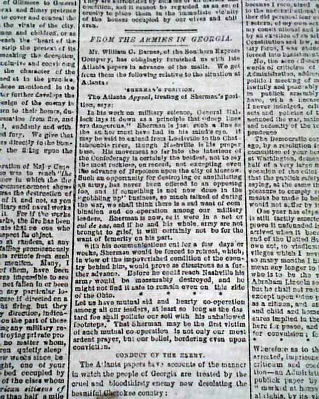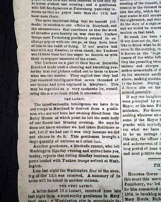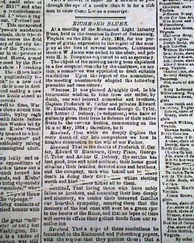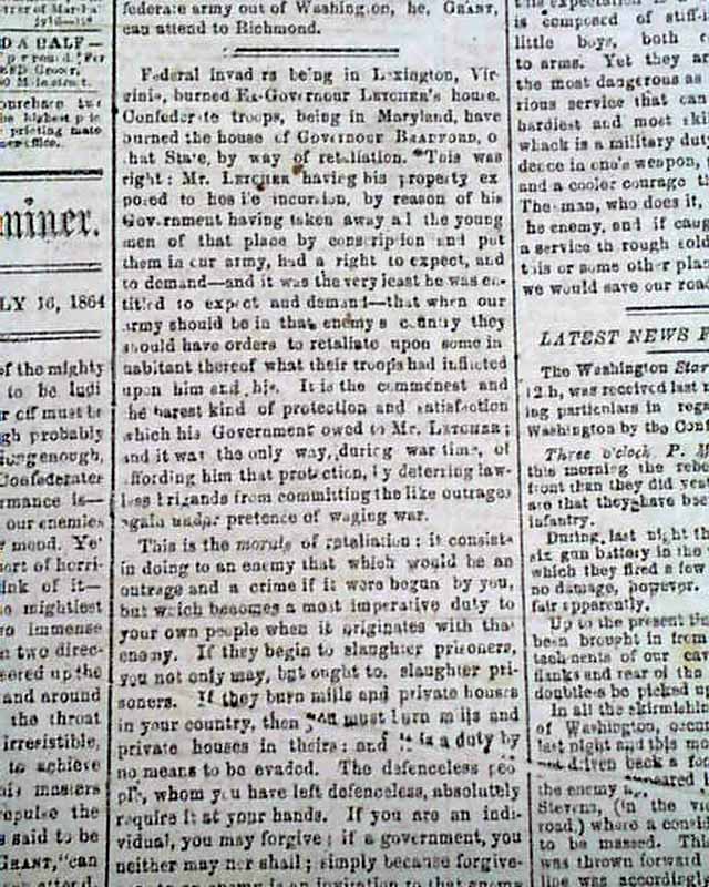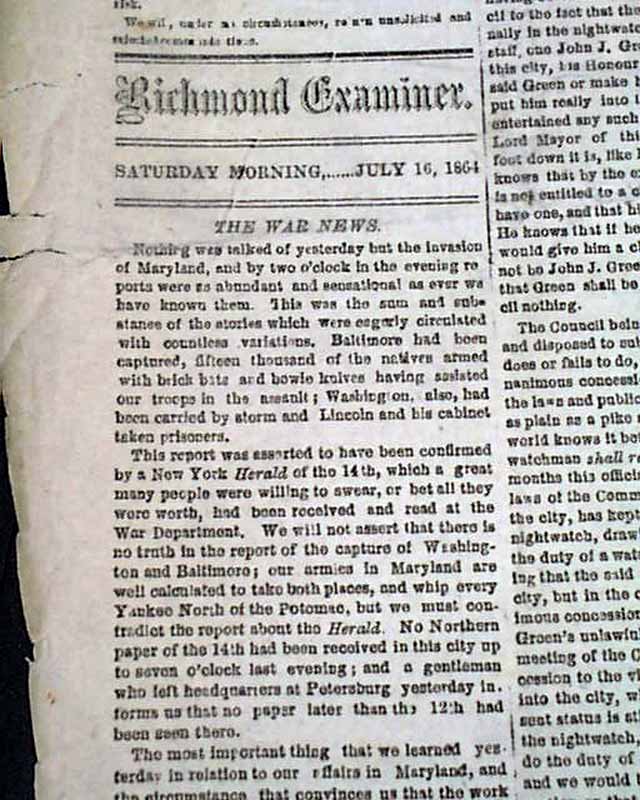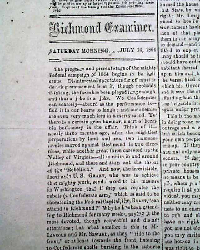 RICHMOND EXAMINER, Virginia, July 16, 1864 This issue has: "The War News--The Latest--The Latest Rumor" "Point Lookout "From Atlanta--Battle at Tupelo" "Very Latest From the North" "Richmond Blues" "Latest News From the North" "From the Armies in Georgia" and more including the always interesting editorial with a decidedly Confederate bias.