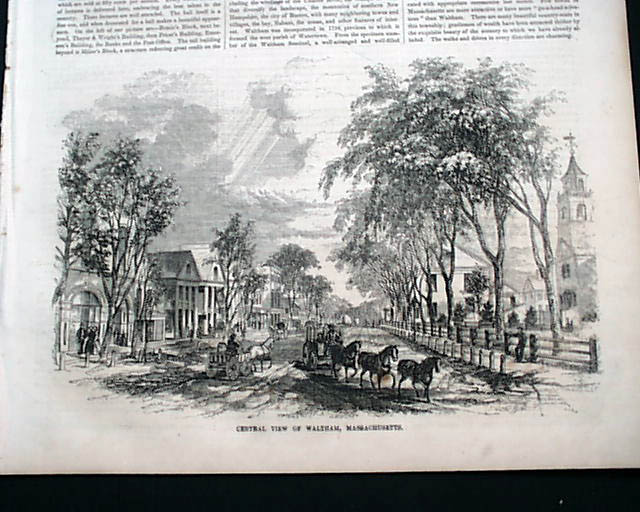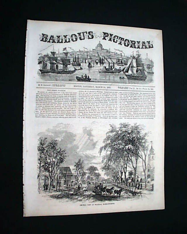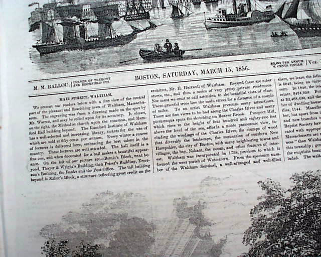 BALLOU'S PICTORIAL, Boston, March 15, 1856 Most of the front page is taken up with: "Central View of Waltham, Massachusetts" with a related article.