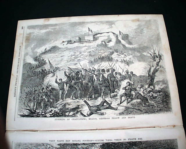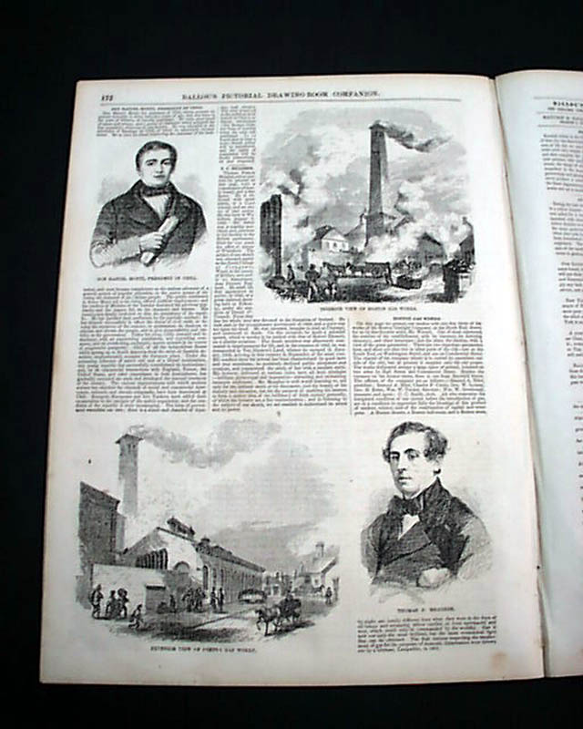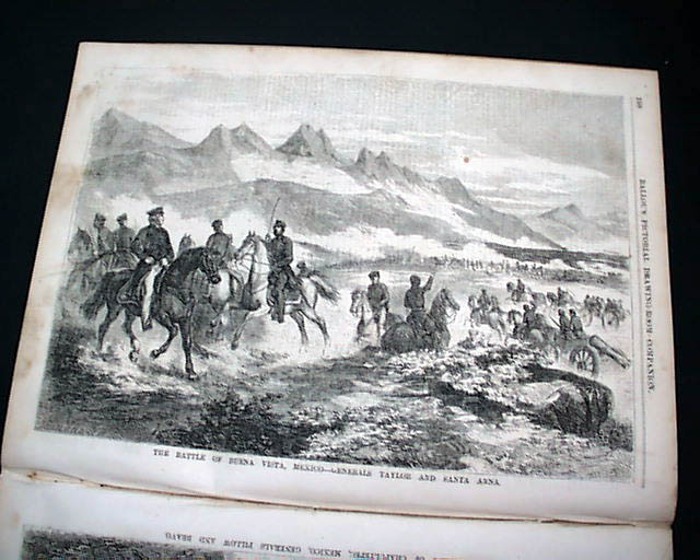 Prints within include two full page prints on: "Then Battle off Buena Vista, Mexico--Generals Taylor &B Santa Anna" and "Storming of Chapultepec, Mexico--Generals Pillow & Bravo" plus two prints of the "Boston Gas Works" and a back page print of: "Winter Amusement in Stockholm, Sweden".