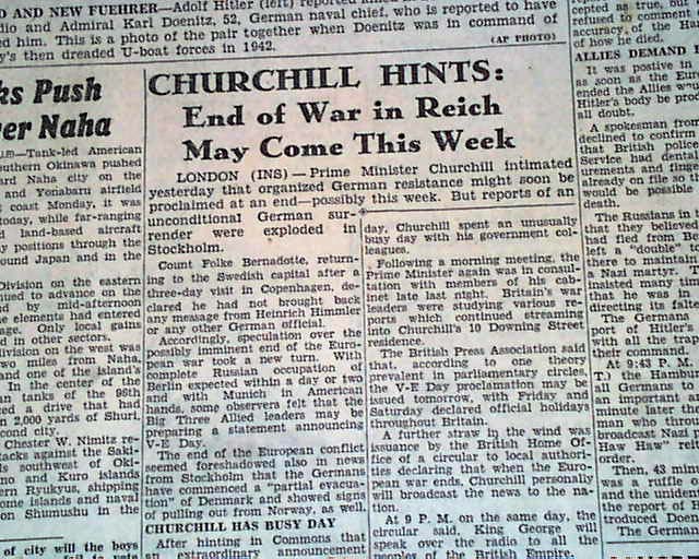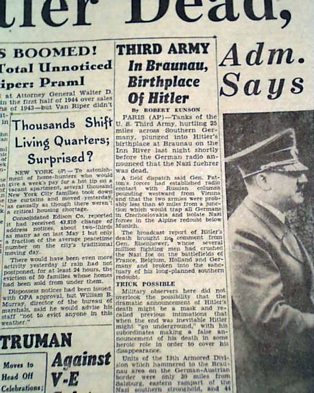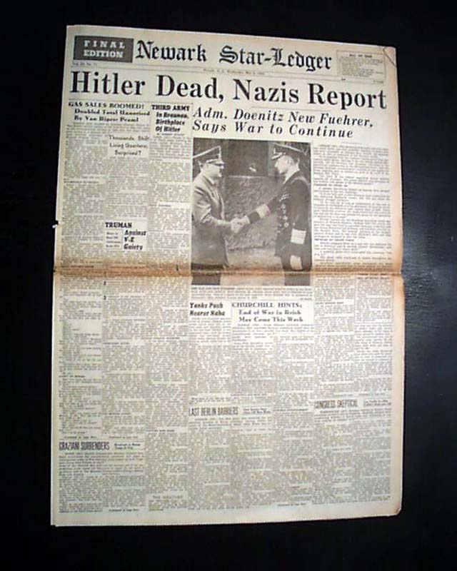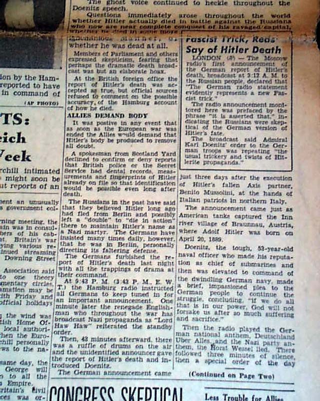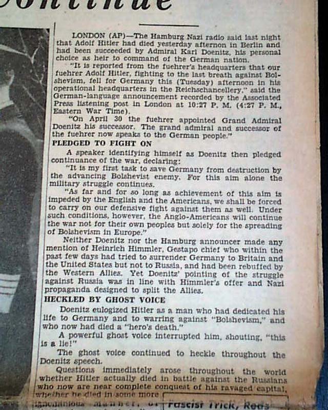 Part of the news report includes: "...It is reported from the fuehrer's headquarters that our fuehrer Adolf Hitler, fighting to the last breath against Bolshevism, fell for Germany this (Tueday) afternoon in his operational headquarters...". He actually committed suicide.