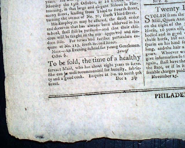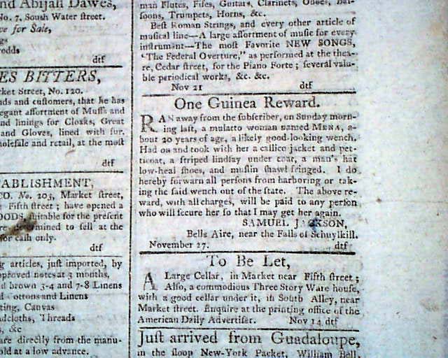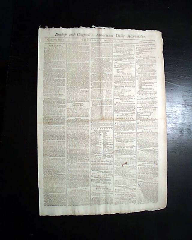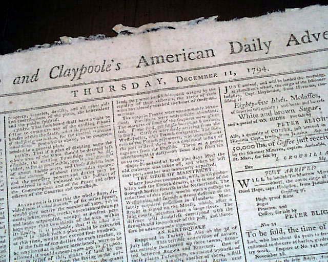 DUNLAP & CLAYPOOLE'S AMERICAN DAILY ADVERTISER, Philadelphia, Dec. 11, 1794 The back page is filled with ads including 24 illustrated ship ads. There are several advertisements relating to slaves.