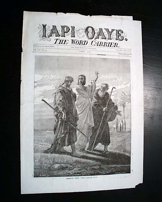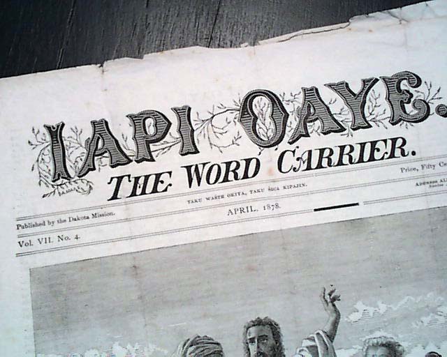 IAPI OAYE, THE WORD CARRIER, published by the Dakota Mission in Dakota Indian territory (later South Dakota), April, 1878 This very uncommon newspaper was founded in 1871. Pages 2 and 3 are in the Dakota Indian language while the last page is in English.In 1884 the editor decided to divide & separately publish the Dakota and English language material, titled separately "Iapi Oaye" and "Word Carrier". This issue precedes that event and carries both names in the masthead.