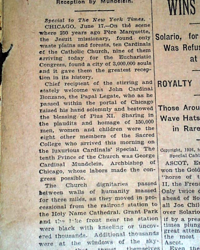 The top of the front page has a one column heading: "CHEERING THOUSANDS WELCOME CARDINALS IN CHICAGO STREETS" with subheads. (see) Coverage continues on page 11 with 2 related photos.