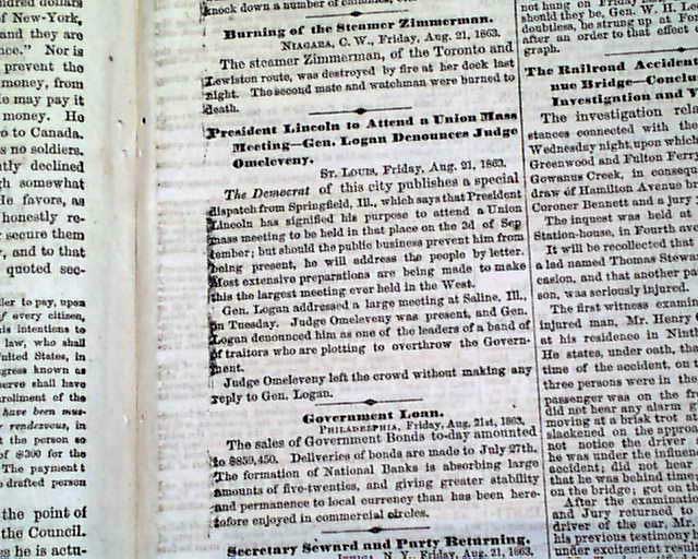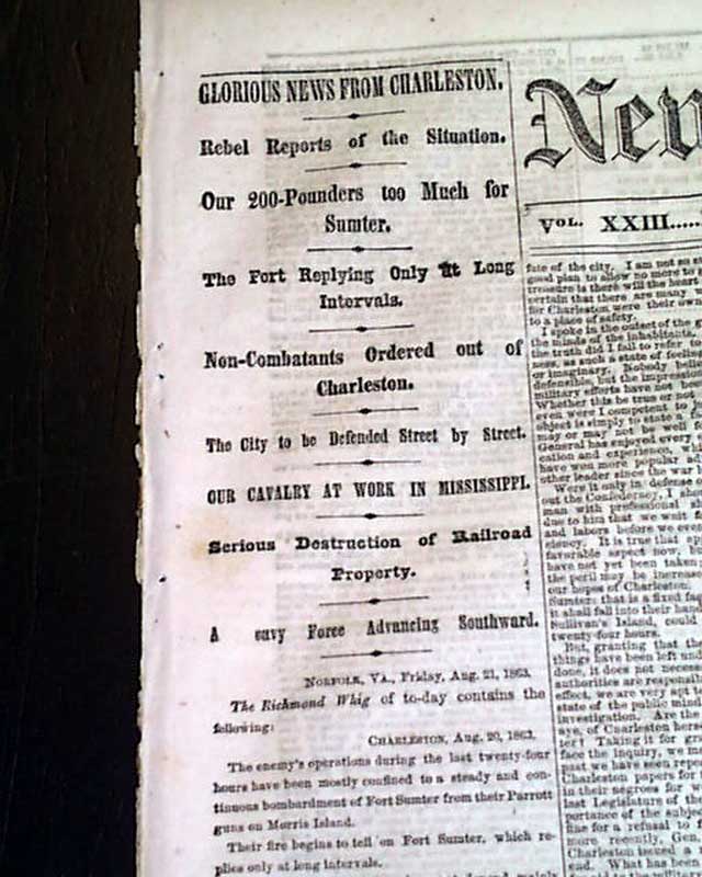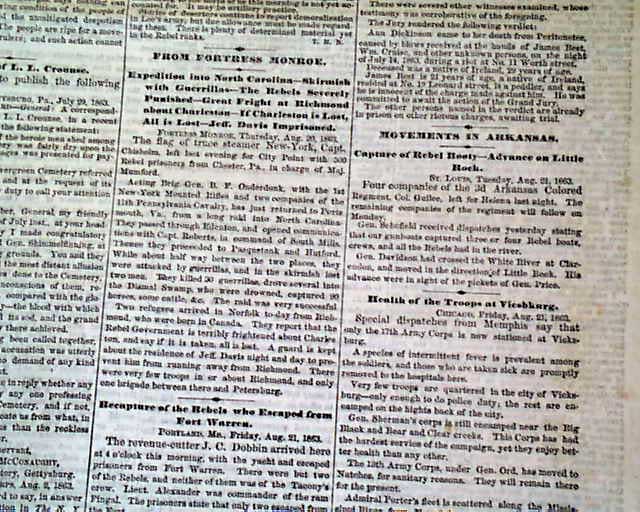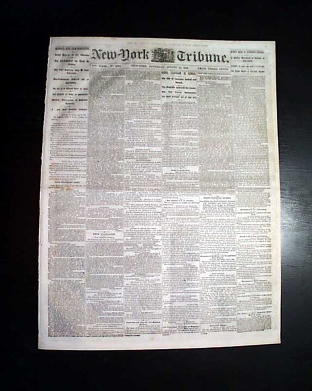 NEW YORK DAILY TRIBUNE, Aug. 22, 1863 Front page column heads include ""REBEL VANDALISM IN KANSAS" "The City of Lawrence Sacked and Burned" "The Guerrilla Quantrell the Leader" "GLORIOUS NEWS FROM CHARLESTON" and much more.
