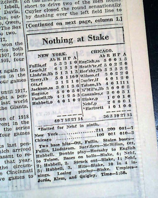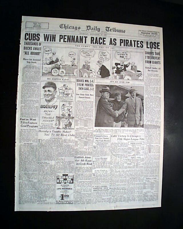 The front page of this section has a nice banner headline: "CUBS WIN PENNANT RACE AS PIRATES LOSE" with subheads, related photo and illustration. (see) Nice for display. First report coverage on the 1932 Chicago Cubs winning the National League pennant. They would face the Philadelphia Athletics in the World Series in which they lost.
