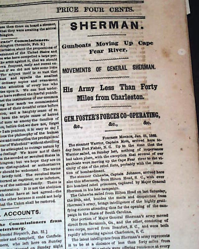 NEW YORK HERALD, Feb. 3, 1865 Among the front page column heads on the Civil War are: "SAVANNAH" "Terrible Conflagration in the City" "More than 200 Buildings Destroyed" "The City Shelled for Two Hours" "Fearful Scenes" "SHERMAN" "Movements of General Sherman" "His Army Less Than 40 Miles from Charleston" "The Peace Mission" "President Lincoln En Route for Fortress Monroe" "Soldiers of Both Armies Greet Them with Hearty Cheers" and more.
