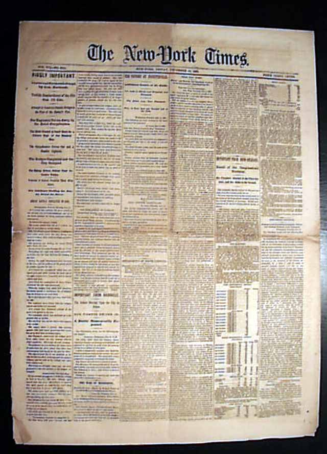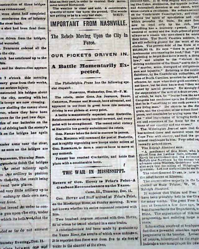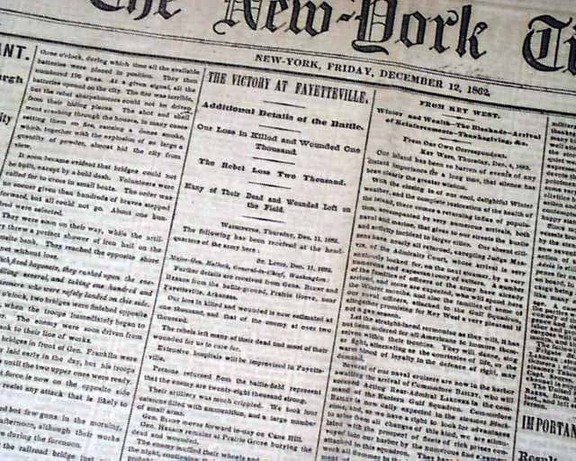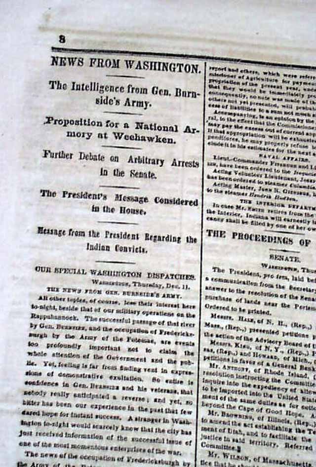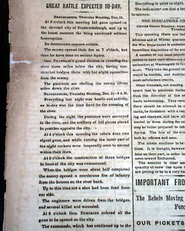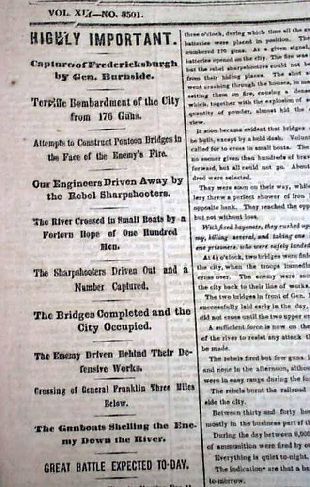 Among the one column headlines on the Civil War are: "HIGHLY IMPORTANT" "Capture of Fredericksburgh by Gen. Burnside" "Terrific Bombardment of the City from 176 Guns" "The Sharpshooters Driven Out and a Number Captured" "THE VICTORY AT FAYETTEVILLE" "Additional Details of the Battle" and more.