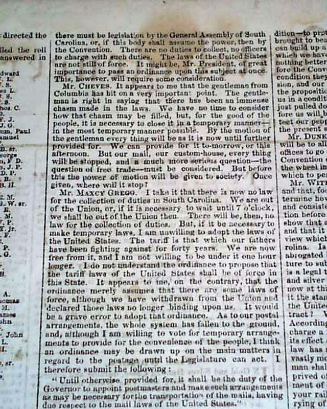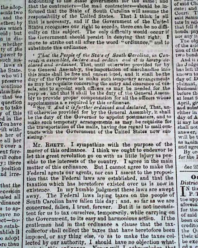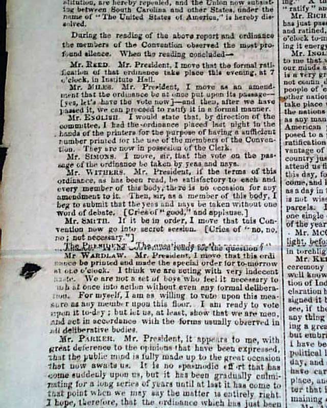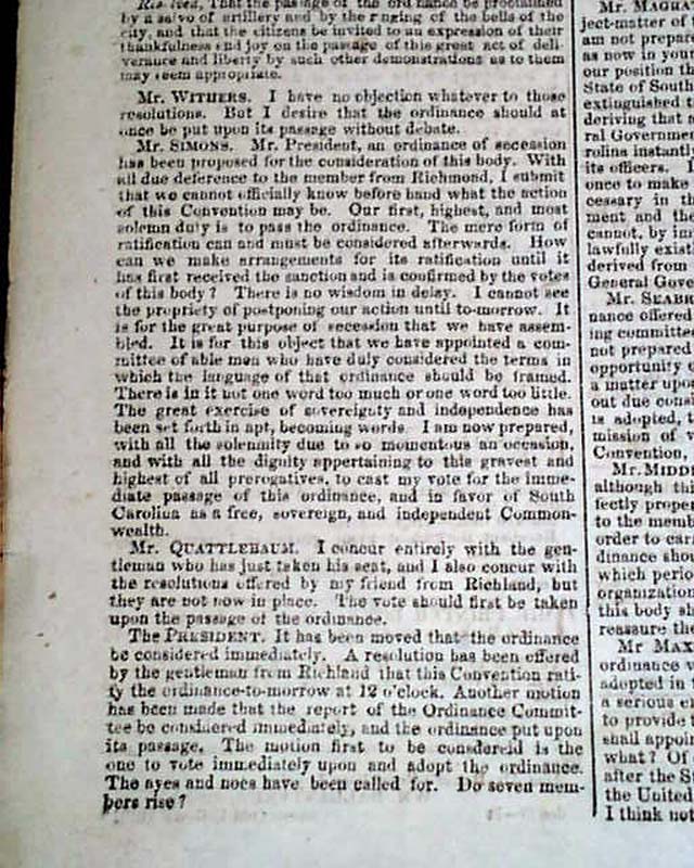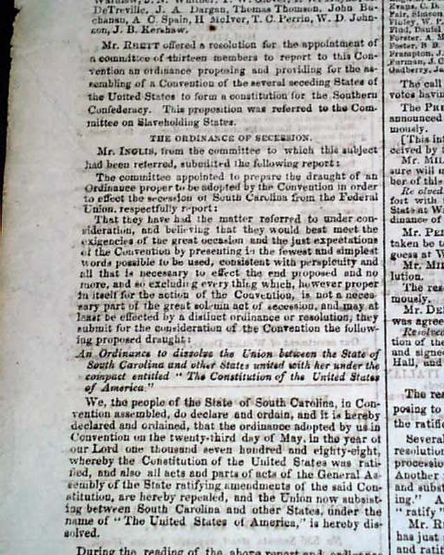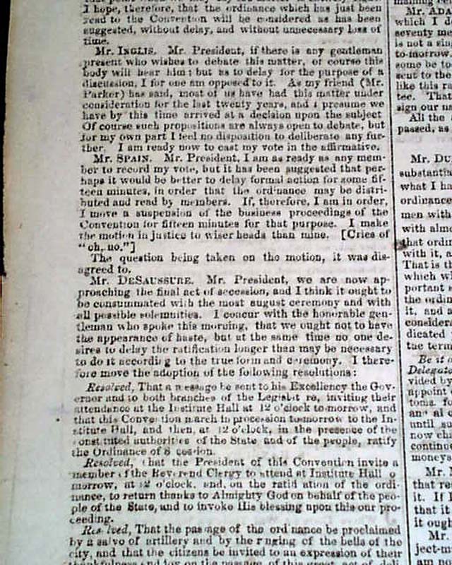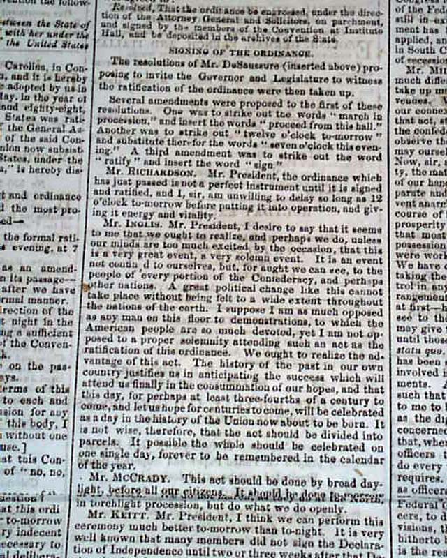 True to the reporting style of this newspaper, there is great, detailed, verbatim reporting on the events of that fateful day, and not surprisingly includes the full text of the Ordinance of Secession. It is prefaced with: "An ordinance to dissolve the Union between the State of South Carolina and other States united with her under the compact entitled 'The Constitution of the United States of America' ". What follows is the notable text of the Ordinance: "We, the People of the State of South Carolina in convention assembled, do declare and ordain, and it is hereby declared and ordained, That the Ordinance adopted by us in Convention, on the twenty-third day of May, in the year of our Lord One thousand Seven hundred and eighty-eight, whereby the Constitution of the United States of America was ratified, and also all Acts and parts of Acts of the General Assembly of the State, ratifying amendments of the said Constitution hereby repealed; and that the union now subsisting between South Carolina and other States, under the name of the "United States of America", is hereby dissolved."