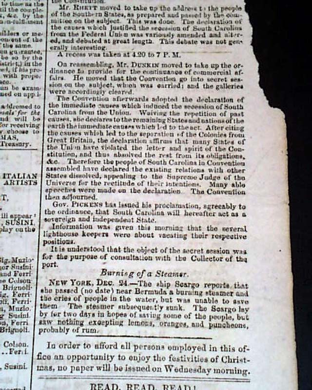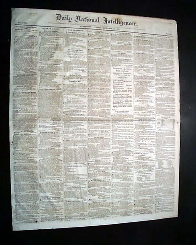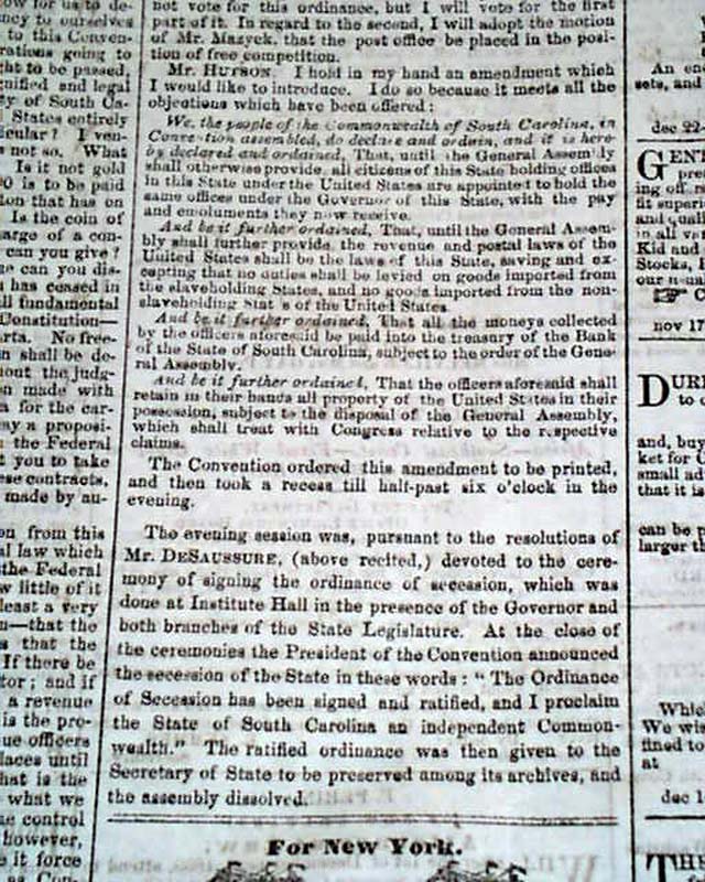 DAILY NATIONAL INTELLIGENCER, Washington, Dec. 25, 1860  A simply wonderfully historic issue as over half of page 2 is headed: "South Carolina- Proceedings of The Convention" for  December 20, which was date that South Carolina formally seceded from the Union.