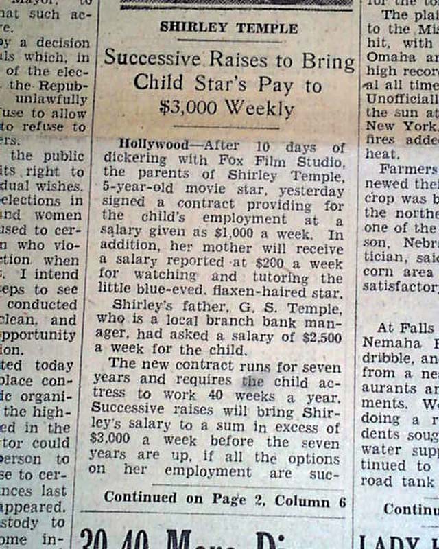 The front page has a one column heading: "Shirley Temple On Contract at $1,000 a Week" with subhead and photo.