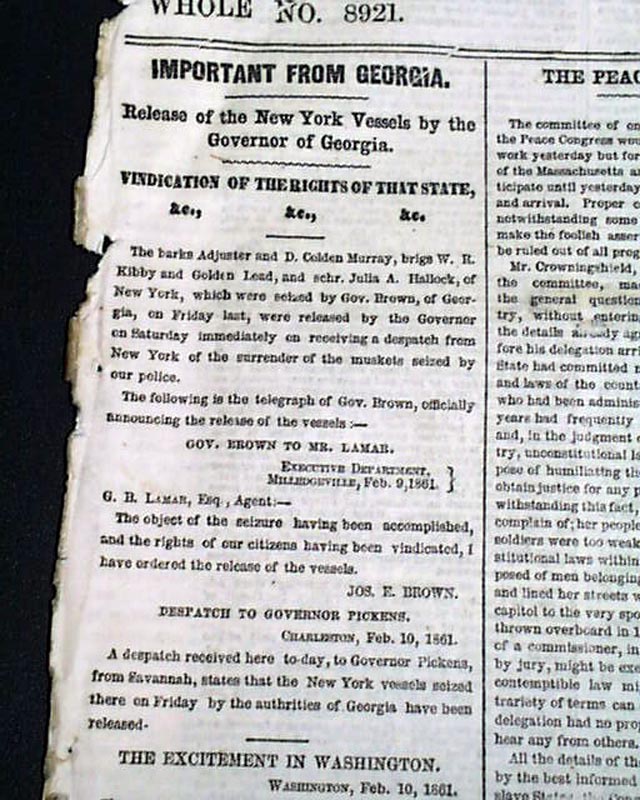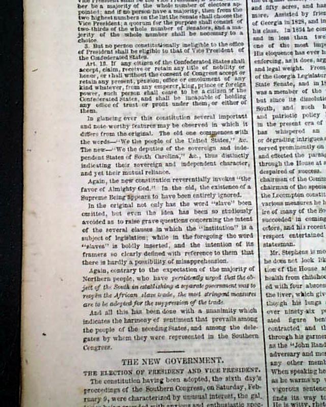 Also on the back page: "The New Government - Election of President & Vice President" noting the results: Jefferson Davis as President, Alexander Stephens as Vice President. Also: "Sketches of the Elect" with very descriptive text on them; "The City of Montgomery - The Provisional Capitol of the New Confederacy" "The Effect of the Southern Congress" "The New Confederacy" and more.